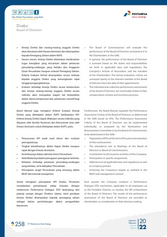 258 PT Pertamina Hulu Energi 2022Laporan TahunanAnnual ReportTata Kelola Perusahaan yang BaikGood Corporate Governance%u00bb Kinerja Direksi dan masing-masing anggota Direksi akan dievaluasi oleh Dewan Komisaris dan disampaikan kepada Pemegang Saham dalam RUPS.%u00bb Secara umum, kinerja Direksi ditentukan berdasarkan tugas kewajiban yang tercantum dalam peraturan perundang-undangan yang berlaku dan Anggaran Dasar Perusahaan maupun amanat Pemegang Saham. Kriteria Evaluasi formal disampaikan secara terbuka kepada anggota Direksi yang bersangkutan sejak tanggal pengangkatannya.%u00bb Evaluasi terhadap kinerja Direksi secara keseluruhan dan kinerja masing-masing anggota Direksi secara individu akan merupakan bagian tak terpisahkan dalam skema kompensasi dan pemberian insentif bagi anggota Direksi. Board Manual juga mengatur Kriteria Evaluasi Kinerja Direksi yang ditetapkan dalam RUPS berdasarkan KPI. Kriteria kinerja Direksi dapat dilakukan secara individu yang diajukan oleh Komite Nominasi dan Remunerasi atau oleh Dewan Komisaris untuk ditetapkan dalam RUPS, yaitu:%u00bb Penyusunan KPI pada awal tahun dan evaluasi pencapaiannya. %u00bb Tingkat kehadirannya dalam Rapat Direksi maupun rapat dengan Dewan Komisaris. %u00bb Kontribusinya dalam aktivitas bisnis Perusahaan. %u00bb Keterlibatannya dalam penugasan-penugasan tertentu.%u00bb Ketaatan terhadap peraturan perundang-undangan yang berlaku, serta kebijakan Perusahaan. %u00bb Pencapaian target Perusahaan yang tertuang dalam RKAP dan kontrak manajemen.Untuk mengukur pencapaian KPI Direksi, Perseroan menjalankan pemantauan setiap triwulan dengan mekanisme Performance Dialogue (PD) berjenjang dari pekerja sampai dengan Direktur Utama. Hasil penilaian kinerja Direksi disampaikan kepada pemegang saham sebagai bahan pertimbangan dalam pengambilan keputusan. %u00bb The Board of Commissioners will evaluate the performance of the Board of Directors and present it to the Shareholders in the GMS. %u00bb In general, the performance of the Board of Directors is assessed based on the duties and responsibilities set forth in applicable laws and regulations, the Company%u2019s Articles of Association, and the mandate of the Shareholders. The formal evaluation criteria are conveyed openly to the relevant member of the Board of Directors from the date of their appointment.%u00bb The individual and collective performance assessments of the Board of Directors are inextricably linked to their compensation scheme and incentive provision.Furthermore, the Board Manual regulates the Performance Assessment Criteria of the Board of Directors, as determined in the GMS based on KPIs. The Performance Assessment Criteria of the Board of Directors can be implemented individually, as proposed by the Nomination and Remuneration Committee or by the Board of Commissioners to be determined in the GMS:%u00bb Preparation of KPIs at the start of the year and evaluation of their achievement.%u00bb The attendance rate at Meetings of the Board of Directors or Board of Commissioners.%u00bb Contribution to the business activities of the Company.%u00bb Participation in specific assignments. %u00bb Adherence to all applicable laws and regulations as well as Company policies.%u00bb Achieving the Company%u2019s targets as outlined in the RKAP and management contract.Each quarter, the Company conducts a Performance Dialogue (PD) mechanism, applicable to all employees up to the President Director, to monitor the KPI achievement of the Board of Directors. The results of the performance assessment of the Board of Directors are provided to shareholders as consideration in their decision-making. Board of DirectorsDireksi
