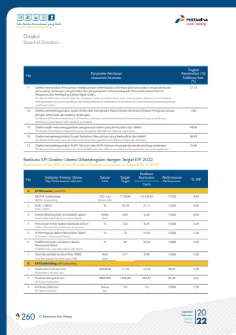260 PT Pertamina Hulu Energi 2022Laporan TahunanAnnual ReportTata Kelola Perusahaan yang BaikGood Corporate GovernanceNo Parameter PenilaianAssessment ParameterTingkat Pemenuhan (%)Fulfillment Rate (%)9 Direksi memastikan Perusahaan melaksanakan keterbukaan informasi dan komunikasi sesuai peraturan perundang-undangan yang berlaku dan penyampaian informasi kepada Dewan Komisaris/Dewan Pengawas dan Pemegang Saham tepat waktu.The Board of Directors ensures that the Company carries out information and communication disclosure in accordance with applicable laws and regulations and timely delivery of information to the Board of Commissioners/Supervisory Board and Shareholders.77.1310 Direksi menyelenggarakan rapat Direksi dan menghadiri Rapat Dewan Komisaris/Dewan Pengawas sesuai dengan ketentuan perundang-undangan.The Board of Directors holds Board of Directors meetings and attends Board of Commissioners/Supervisory Board meetings in accordance with statutory provisions.10011 Direksi wajib menyelenggarakan pengawasan intern yang berkualitas dan efektif.The Board of Directors is required to carry out quality and effective internal supervision.94.6812 Direksi menyelenggarakan fungsi Sekretaris Perusahaan yang berkualitas dan efektif.The Board of Directors oversees the performance of a qualified and effective Corporate Secretary.96.8413 Direksi menyelenggarakan RUPS Tahunan dan RUPS lainnya sesuai peraturan perundang-undangan. The Board of Directors conducts the Annual GMS and other GMS in accordance with applicable laws and regulations.75.96No Indikator Kinerja UtamaKey Performance IndicatorSatuanUnitTargetTargetRealisasi Realization PerformancePerformance % WPTW-IVA KPI Bersama | Joint KPI%u2019s1 EBITDA SubholdingEBITDA SubholdingUSD JutaMillion USD7.158,98 10,428.83 110,00 8,802 ROIC %u2265 WACCROIC %u2265 WACC% 10,19 21,11 110,00 6,603 Interest Bearing Debt to Invested CapitalInterest Bearing Debt to Invested CapitalRasioRatio0,30 0,25 110,00 6,604 Penurunan Emisi Karbon Dioksida (CO2e)Carbon Dioxide (CO2e) Emission Reduction% 1,25 6,55 110,00 5,505 % Perempuan dalam Nominated Talent% Female in Nominated Talent% 13 14,67 110,00 5,506 % Milenial (usia <42 tahun) dalam Nominated Talent% Millennials (<42 years old) in Top Talent% 26 34,36 110,00 5,507 Total Recordable Incident Rate (TRIR)Total Recordable Incident Rate (TRIR)RateRate0,11 0,09 110,00 5,50B KPI Subholding | KPI Subholding1 Production Cost per UnitProduction Cost per UnitUSD/BOE 11,74 12,56 98,09 5,892 Produksi Minyak & GasOil & Gas ProductionMBOEPD 1.046,99 967,27 97,30 6,813 R/P Ratio Oil & GasR/P Ratio Oil & GasTahunYear7,0 7,5 110,00 7,70Realisasi KPI Direktur Utama Dibandingkan dengan Target KPI 2022Realization of the KPIs of the President Director compared to Target KPIs in 2022Board of DirectorsDireksi