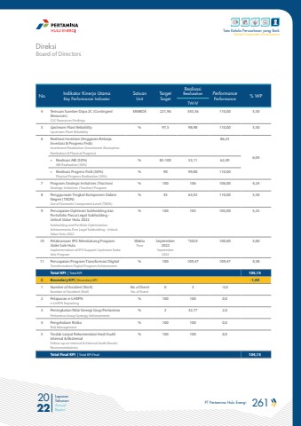 PT Pertamina Hulu Energi 261 2022Laporan TahunanAnnual ReportTata Kelola Perusahaan yang BaikGood Corporate GovernanceNo Indikator Kinerja UtamaKey Performance IndicatorSatuanUnitTargetTargetRealisasi Realization PerformancePerformance % WPTW-IV4 Temuan Sumber Daya 2C (Contingent Resources)C2C Resources FindingsMMBOE 221,96 345,36 110,00 5,505 Upstream Plant ReliabilityUpstream Plant Reliability% 97,5 98,98 110,00 5,506 Realisasi Investasi (Anggaran Belanja Investasi & Progress Fisik)Investment Realization (Investment Absorption Realization & Physical Progress)86,256,04 %u00bb Realisasi ABI (50%)ABI Realization (50%)% 85-100 53,11 62,49%u00bb Realisasi Progress Fisik (50%)Physical Progress Realization (50%)% 90 99,80 110,007 Program Strategic Initiatives (Traction)Strategic Initiatives (Traction) Program% 100 106 106,00 4,248 Penggunaan Tingkat Komponen Dalam Negeri (TKDN)Use of Domestic Component Level (TKDN)% 45 63,92 110,00 5,509 Pencapaian Optimasi Subholding dan Portofolio Pasca Legal Subholding - Unlock Value Hulu 2022Subholding and Portfolio Optimization Achievements Post Legal Subholding - Unlock Value Hulu 2022% 100 105 105,00 5,2510 Pelaksanaan IPO Mendukung Program Stake Sale HuluImplementation of IPO Support Upstream Stake Sale ProgramWaktuTimeSeptember 2022September 2022*2023 100,00 5,0011 Pencapaian Program Transformasi DigitalTransformation Digital Program Achievement% 100 109,47 109,47 4,38Total KPI | Total KPI 105,15C Boundary KPI | Boundary KPI -1,001 Number of Accident (NoA)Number of Accident (NoA)No. of EventNo. of Event0 3 -3,02 Pelaporan e-LHKPNe-LHKPN Reporting% 100 100 0,03 Peningkatan Nilai Sinergi Grup PertaminaPertamina Group Synergy Achievements% 2 32,77 2,04 Pengelolaan RisikoRisk Management% 100 100 0,05 Tindak Lanjut Rekomendasi Hasil Audit Internal & EksternalFollow-up on Internal & External Audit Results Recommendations% 100 100 0,0Total Final KPI | Total KPI Final 104,15Board of DirectorsDireksi
