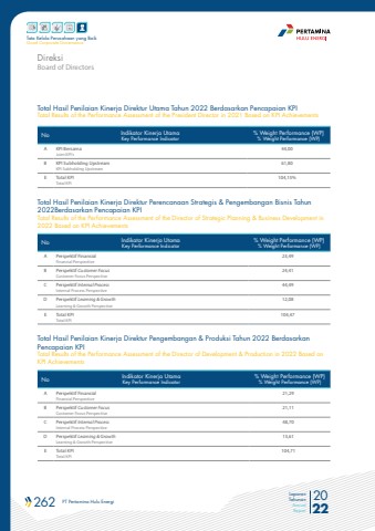 262 PT Pertamina Hulu Energi 2022Laporan TahunanAnnual ReportTata Kelola Perusahaan yang BaikGood Corporate GovernanceTotal Hasil Penilaian Kinerja Direktur Utama Tahun 2022 Berdasarkan Pencapaian KPITotal Results of the Performance Assessment of the President Director in 2021 Based on KPI AchievementsTotal Hasil Penilaian Kinerja Direktur Perencanaan Strategis & Pengembangan Bisnis Tahun 2022Berdasarkan Pencapaian KPITotal Results of the Performance Assessment of the Director of Strategic Planning & Business Development in 2022 Based on KPI AchievementsTotal Hasil Penilaian Kinerja Direktur Pengembangan & Produksi Tahun 2022 Berdasarkan Pencapaian KPITotal Results of the Performance Assessment of the Director of Development & Production in 2022 Based on KPI AchievementsNo Indikator Kinerja UtamaKey Performance Indicator% Weight Performance (WP)% Weight Performance (WP)A KPI Bersama Joint KPI%u2019s44,00B KPI Subholding UpstreamKPI Subholding Upstream61,80E Total KPITotal KPI104,15%No Indikator Kinerja UtamaKey Performance Indicator% Weight Performance (WP)% Weight Performance (WP)A Perspektif Finansial Financial Perspective23,49B Perspektif Customer FocusCustomer Focus Perspective24,41C Perspektif Internal Process Internal Process Perspective44,49D Perspektif Learning & Growth Learning & Growth Perspective12,08E Total KPITotal KPI104,47No Indikator Kinerja UtamaKey Performance Indicator% Weight Performance (WP)% Weight Performance (WP)A Perspektif Finansial Financial Perspective21,29B Perspektif Customer FocusCustomer Focus Perspective21,11C Perspektif Internal Process Internal Process Perspective48,70D Perspektif Learning & Growth Learning & Growth Perspective13,61E Total KPITotal KPI104,71Board of DirectorsDireksi