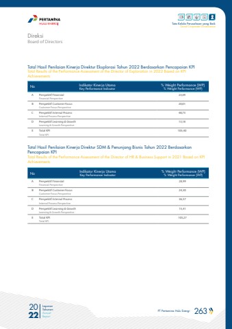 PT Pertamina Hulu Energi 263 2022Laporan TahunanAnnual ReportTata Kelola Perusahaan yang BaikGood Corporate GovernanceTotal Hasil Penilaian Kinerja Direktur Eksplorasi Tahun 2022 Berdasarkan Pencapaian KPITotal Results of the Performance Assessment of the Director of Exploration in 2022 Based on KPI AchievementsTotal Hasil Penilaian Kinerja Direktur SDM & Penunjang Bisnis Tahun 2022 Berdasarkan Pencapaian KPITotal Results of the Performance Assessment of the Director of HR & Business Support in 2021 Based on KPI AchievementsNo Indikator Kinerja UtamaKey Performance Indicator% Weight Performance (WP)% Weight Performance (WP)A Perspektif Finansial Financial Perspective23,49B Perspektif Customer FocusCustomer Focus Perspective20,01C Perspektif Internal Process Internal Process Perspective48,73D Perspektif Learning & Growth Learning & Growth Perspective13,18E Total KPITotal KPI105,40No Indikator Kinerja UtamaKey Performance Indicator% Weight Performance (WP)% Weight Performance (WP)A Perspektif Finansial Financial Perspective28,99B Perspektif Customer FocusCustomer Focus Perspective24,30C Perspektif Internal Process Internal Process Perspective36,57D Perspektif Learning & Growth Learning & Growth Perspective15,41E Total KPITotal KPI105,27Board of DirectorsDireksi
