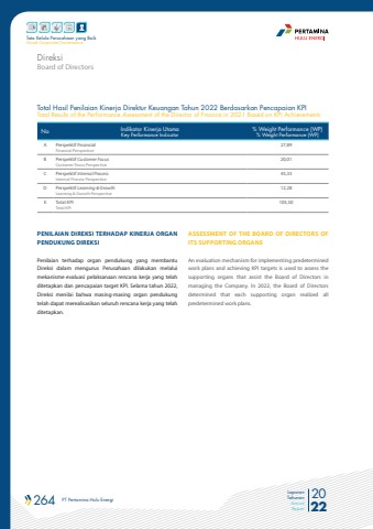 264 PT Pertamina Hulu Energi 2022Laporan TahunanAnnual ReportTata Kelola Perusahaan yang BaikGood Corporate GovernanceTotal Hasil Penilaian Kinerja Direktur Keuangan Tahun 2022 Berdasarkan Pencapaian KPITotal Results of the Performance Assessment of the Director of Finance in 2021 Based on KPI AchievementsNo Indikator Kinerja UtamaKey Performance Indicator% Weight Performance (WP)% Weight Performance (WP)A Perspektif Finansial Financial Perspective27,89B Perspektif Customer FocusCustomer Focus Perspective20,01C Perspektif Internal Process Internal Process Perspective45,33D Perspektif Learning & Growth Learning & Growth Perspective12,28E Total KPITotal KPI105,50PENILAIAN DIREKSI TERHADAP KINERJA ORGAN PENDUKUNG DIREKSIPenilaian terhadap organ pendukung yang membantu Direksi dalam mengurus Perusahaan dilakukan melalui mekanisme evaluasi pelaksanaan rencana kerja yang telah ditetapkan dan pencapaian target KPI. Selama tahun 2022, Direksi menilai bahwa masing-masing organ pendukung telah dapat merealisasikan seluruh rencana kerja yang telah ditetapkan. ASSESSMENT OF THE BOARD OF DIRECTORS OF ITS SUPPORTING ORGANSAn evaluation mechanism for implementing predetermined work plans and achieving KPI targets is used to assess the supporting organs that assist the Board of Directors in managing the Company. In 2022, the Board of Directors determined that each supporting organ realized all predetermined work plans.Board of DirectorsDireksi