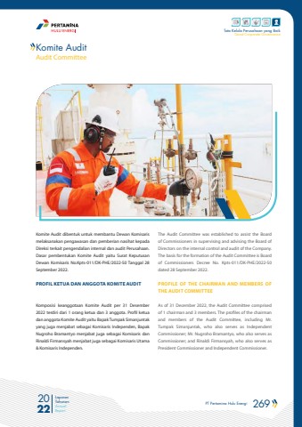 PT Pertamina Hulu Energi 269 2022Laporan TahunanAnnual ReportTata Kelola Perusahaan yang BaikGood Corporate GovernanceKomite Audit dibentuk untuk membantu Dewan Komisaris melaksanakan pengawasan dan pemberian nasihat kepada Direksi terkait pengendalian internal dan audit Perusahaan. Dasar pembentukan Komite Audit yaitu Surat Keputusan Dewan Komisaris No.Kpts-011/DK-PHE/2022-S0 Tanggal 28 September 2022.PROFIL KETUA DAN ANGGOTA KOMITE AUDIT Komposisi keanggotaan Komite Audit per 31 Desember 2022 terdiri dari 1 orang ketua dan 3 anggota. Profil ketua dan anggota Komite Audit yaitu Bapak Tumpak Simanjuntak yang juga menjabat sebagai Komisaris Independen, Bapak Nugroho Bramantyo menjabat juga sebagai Komisaris dan Rinaldi Firmansyah menjabat juga sebagai Komisaris Utama & Komisaris Independen. The Audit Committee was established to assist the Board of Commissioners in supervising and advising the Board of Directors on the internal control and audit of the Company. The basis for the formation of the Audit Committee is Board of Commissioners Decree No. Kpts-011/DK-PHE/2022-S0 dated 28 September 2022.PROFILE OF THE CHAIRMAN AND MEMBERS OF THE AUDIT COMMITTEEAs of 31 December 2022, the Audit Committee comprised of 1 chairman and 3 members. The profiles of the chairman and members of the Audit Committee, including Mr. Tumpak Simanjuntak, who also serves as Independent Commissioner; Mr. Nugroho Bramantyo, who also serves as Commissioner; and Rinaldi Firmansyah, who also serves as President Commissioner and Independent Commissioner.Komite AuditAudit Committee