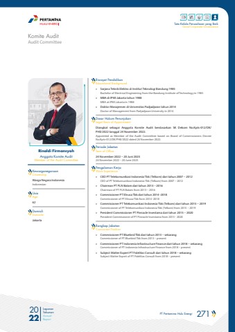 PT Pertamina Hulu Energi 271 2022Laporan TahunanAnnual ReportTata Kelola Perusahaan yang BaikGood Corporate GovernanceRinaldi FirmansyahAnggota Komite AuditMember of the Audit CommitteeKewarganegaraanCitizenshipRiwayat PendidikanEducational BackgroundDasar Hukum PenunjukanLegal Basis of AppointmentPeriode JabatanTerm of OfficePengalaman KerjaWork ExperienceRangkap JabatanConcurrent PositionUsiaAgeDomisili DomicileWarga Negara Indonesia Indonesian%u00bb Sarjana Teknik Elektro di Institut Teknologi Bandung 1985Bachelor of Electrical Engineering from the Bandung Institute of Technology in 1985 %u00bb MBA di IPMI Jakarta tahun 1988MBA at IPMI Jakarta in 1988 %u00bb Doktor Manajemen di Universitas Padjadjaran tahun 2014Doctor of Management from Padjadjaran University in 2014Diangkat sebagai Anggota Komite Audit berdasarkan SK Dekom No.Kpts-012/DK/PHE/2022 tanggal 24 November 2022.Appointed as Member of the Audit Committee based on Board of Commissioners Decree No.Kpts-012/DK/PHE/2022 dated 24 November 2022.24 November 2022 %u2013 20 Juni 2023 24 November 2022 %u2013 20 June 2023%u00bb CEO PT Telekomunikasi Indonesia Tbk (Telkom) dari tahun 2007 %u2013 2012CEO of PT Telekomunikasi Indonesia Tbk (Telkom) from 2007 %u2013 2012%u00bb Chairman PT PLN Batam dari tahun 2013 %u2013 2016Chairman of PT PLN Batam from 2013 %u2013 2016%u00bb Commissioner PT Elnusa Tbk dari tahun 2014 -2018 Commissioner of PT Elnusa Tbk from 2014 -2018%u00bb Commissioner PT Telekomunikasi Indonesia Tbk (Telkom) dari tahun 2015 %u2013 2019Commissioner of PT Telekomunikasi Indonesia Tbk (Telkom) from 2015 %u2013 2019%u00bb President Commissioner PT Pinnacle Investama dari tahun 2015 %u2013 2020President Commissioner of PT Pinnacle Investama from 2015 - 2020%u00bb Commissioner PT Bluebird Tbk dari tahun 2013 %u2013 sekarangCommissioner of PT Bluebird Tbk from 2013 %u2013 present%u00bb Commissioner PT Indonesia Infrastructure Finance dari tahun 2018 %u2013 sekarangCommissioner of PT Indonesia Infrastructure Finance from 2018 %u2013 present%u00bb Subject Matter Expert PT Fidelitas Consult dari tahun 2018 %u2013 sekarangSubject Matter Expert of PT Fidelitas Consult from 2018 %u2013 present 62JakartaAudit CommitteeKomite Audit