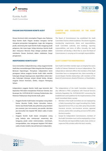 PT Pertamina Hulu Energi 275 2022Laporan TahunanAnnual ReportTata Kelola Perusahaan yang BaikGood Corporate GovernancePIAGAM DAN PEDOMAN KOMITE AUDITDewan Komisaris telah menetapkan Piagam atau Pedoman Kerja Komite Audit. Piagam tersebut mengatur hal-hal mengenai persyaratan keanggotaan, tugas dan tanggung jawab, wewenang dan rapat Komite Audit, tanggung jawab pelaporan, dan masa tugas. Setiap tahunnya, Komite Audit akan menyusun Rencana Kerja sebagai panduan dalam membantu Dewan Komisaris dalam melakukan fungsi pengawasan.INDEPENDENSI KOMITE AUDITGuna memastikan independensinya, setiap anggota Komite Audit akan menandatangani Pakta Integritas dan Pernyataan Benturan Kepentingan. Pernyataan independensi berisi penegasan bahwa anggota Komite Audit tidak memiliki hubungan dengan kepengurusan, kepemilikan saham dan/atau hubungan keluarga sampai derajat kedua, dengan anggota Dewan Komisaris, Direksi, maupun Pemegang Saham. Independensi anggota Komite Audit juga tercermin dari kepatuhan PHE dalam menjalankan Peraturan Otoritas Jasa Keuangan No. 55/POJK.04/2015 tentang Pembentukan dan Pedoman Pelaksanaan Kerja Komite Audit, yakni:%u00bb Anggota Komite Audit bukan merupakan orang dalam Kantor Akuntan Publik, Kantor Konsultan Hukum, Kantor Jasa Penilai Publik, atau pihak lain yang memberi jasa asuransi, jasa non-asuransi, jasa penilai, dan/atau jasa konsultasi lain kepada PHE dalam waktu 6 bulan terakhir;%u00bb Anggota Komite Audit bukan merupakan orang yang bekerja atau mempunyai wewenang dan tanggung jawab untuk merencanakan, memimpin, mengendalikan, atau mengawasi kegiatan PHE dalam waktu 6 bulan terakhir, kecuali Komisaris Independen;CHARTER AND GUIDELINES OF THE AUDIT COMMITTEEThe Board of Commissioners has established the Audit Committee Charter or Work Guidelines. The charter regulates membership requirements, duties and responsibilities, Audit Committee authority and meetings, reporting responsibilities, and terms of office. Annually, the Audit Committee will develop a Work Plan to assist the Board of Commissioners in carrying out its oversight responsibilities.AUDIT COMMITTEE INDEPENDENCEEach Audit Committee member signs an Integrity Pact and a Conflict of Interest Statement to ensure independence. The independence statement affirms that members of the Audit Committee have no management ties, share ownership, or second-degree familial relationships with members of the Board of Commissioners, Board of Directors, or Shareholders.The independence of the Audit Committee members is also reflected in PHE%u2019s compliance with Financial Services Authority Regulation No. 55/POJK.04/2015 concerning the Establishment and Guidelines for the Implementation of the Audit Committee%u2019s Work, namely:%u00bb Members of the Audit Committee are not employed by a Public Accounting Firm, Legal Consulting Firm, Public Appraisal Service Firm, or any other party that provides insurance services, non-insurance services, appraisal services, and/or other consulting services to PHE within the last 6 months;%u00bb Except for Independent Commissioners, members of the Audit Committee must not be employed by or have the authority and responsibility to plan, lead, control, or supervise PHE activities within the last 6 months;Audit CommitteeKomite Audit