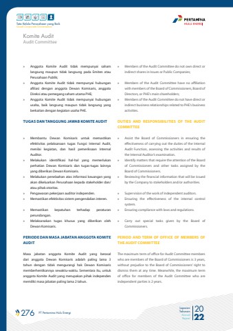 276 PT Pertamina Hulu Energi 2022Laporan TahunanAnnual ReportTata Kelola Perusahaan yang BaikGood Corporate Governance%u00bb Anggota Komite Audit tidak mempunyai sahamlangsung maupun tidak langsung pada Emiten atauPerusahaan Publik;%u00bb Anggota Komite Audit tidak mempunyai hubunganafiliasi dengan anggota Dewan Komisaris, anggotaDireksi atau pemegang saham utama PHE;%u00bb Anggota Komite Audit tidak mempunyai hubunganusaha, baik langsung maupun tidak langsung yangberkaitan dengan kegiatan usaha PHE.TUGAS DAN TANGGUNG JAWAB KOMITE AUDIT %u00bb Membantu Dewan Komisaris untuk memastikanefektivitas pelaksanaan tugas Fungsi Internal Audit,menilai kegiatan, dan hasil pemeriksaan InternalAuditor.%u00bb Melakukan identifikasi hal-hal yang memerlukanperhatian Dewan Komisaris dan tugas-tugas lainnyayang diberikan Dewan Komisaris.%u00bb Melakukan penelaahan atas informasi keuangan yangakan dikeluarkan Perusahaan kepada stakeholder dan/atau pihak otoritas.%u00bb Pengawasan pekerjaan auditor independen.%u00bb Memastikan efektivitas sistem pengendalian interen.%u00bb Memastikan kepatuhan terhadap peraturan perundangan.%u00bb Melaksanakan tugas khusus yang diberikan olehDewan Komisaris.PERIODE DAN MASA JABATAN ANGGOTA KOMITE AUDITMasa jabatan anggota Komite Audit yang berasal dari anggota Dewan Komisaris adalah paling lama 3 tahun dengan tidak mengurangi hak Dewan Komisaris memberhentikannya sewaktu-waktu. Sementara itu, untuk anggota Komite Audit yang merupakan pihak independen memiliki masa jabatan paling lama 2 tahun.%u00bb Members of the Audit Committee do not own direct orindirect shares in Issues or Public Companies;%u00bb Members of the Audit Committee have no affiliationwith members of the Board of Commissioners, Board of Directors, or PHE%u2019s main shareholders;%u00bb Members of the Audit Committee do not have direct or indirect business relationships related to PHE%u2019s business activities. DUTIES AND RESPONSIBILITIES OF THE AUDIT COMMITTEE%u00bb Assist the Board of Commissioners in ensuring theeffectiveness of carrying out the duties of the InternalAudit Function, assessing the activities and results ofthe Internal Auditor%u2019s examination.%u00bb Identify matters that require the attention of the Boardof Commissioners and other tasks assigned by theBoard of Commissioners.%u00bb Reviewing the financial information that will be issuedby the Company to stakeholders and/or authorities.%u00bb Supervision of the work of independent auditors.%u00bb Ensuring the effectiveness of the internal controlsystem.%u00bb Ensuring compliance with laws and regulations.%u00bb Carry out special tasks given by the Board ofCommissioners.PERIOD AND TERM OF OFFICE OF MEMBERS OF THE AUDIT COMMITTEEThe maximum term of office for Audit Committee members who are members of the Board of Commissioners is 3 years, without prejudice to the Board of Commissioners%u2019 right to dismiss them at any time. Meanwhile, the maximum term of office for members of the Audit Committee who are independent parties is 2 years.Audit CommitteeKomite Audit