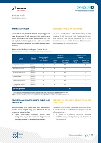 PT Pertamina Hulu Energi 277 2022Laporan TahunanAnnual ReportTata Kelola Perusahaan yang BaikGood Corporate GovernanceMEETINGS OF THE AUDIT COMMITTEEThe Audit Committee held a total of 57 meetings in 2022, including 19 with the Internal Audit Function and 38 with other functions. The average attendance rate of Audit Committee members was 97%. The Board of Commissioners is made aware of all meeting decisions.ACTIVITIES OF THE AUDIT COMMITTEE IN THE FISCAL YEARThroughout 2022, the Audit Committee carried out activities in accordance with its established work program, with the following summary:%u00bb In carrying out its functions, the Audit Committee held 57 meetings and 19 gatherings with the Board of Commissioners.RAPAT KOMITE AUDITSelama tahun 2022, Komite Audit telah menyelenggarakan rapat dengan total 57 kali, sebanyak 19 kali rapat bersama Fungsi Internal Audit dan 38 kali dengan fungsi lain. Ratarata tingkat kehadiran anggota Komite Audit mencapai 97%. Seluruh keputusan rapat akan disampaikan kepada Dewan Komisaris.NamaNameJabatanPositionJumlah Wajib RapatTotal MeetingsKehadiranAttendance KetidakhadiranAbsenceJumlahTotalPersentase PercentageJumlahTotalPersentase PercentageTumpak Simanjuntak KetuaChairman57 56 98 1 2*Rinaldi Firmansyah AnggotaMember8 8 100 - -*Nugroho Bramantyo AnggotaMember49 48 98 1 2Tjatur Purwadi AnggotaMember57 57 100 - -**Arieyando Makmun AnggotaMember8 7 88 1 12**Safriansyah Yanwar RosyadiAnggotaMember49 49 100 - -Rata-rata Kehadiran Attendance Average97Rekapitulasi Kehadiran Rapat Komite AuditRecapitulation of Audit Committee Meeting Attendance * Pada 24 November 2022, Bapak Nugroho Bramantyo digantikan dengan Bapak Rinaldi Firmansyah sebagai Anggota Komite Audit. On 24 November 2022, Mr. Nugroho Bramantyo was replaced with Mr. Rinaldi Firmansyah as Member of the Audit Committee.** Pada 24 November 2022, Bapak Safriansyah Y. Rosyadi digantikan dengan Bapak Arieyando Makmun sebagai Anggota Komite Audit. On November 24, 2022, Mr. Safriansyah Y. Rosyadi was replaced with Mr. Arieyando Makmun as Member of the Audit Committee.PELAKSANAAN KEGIATAN KOMITE AUDIT PADA TAHUN BUKUSepanjang tahun 2022, Komite Audit telah melaksanakan kegiatan sesuai program kerja yang ditetapkan, dengan rangkuman sebagai berikut:%u00bb Dalam menjalankan fungsinya, Komite Audit mengadakan rapat dan pertemuan dengan Dewan Komisaris sebanyak 57 rapat dan 19 pertemuan.Audit CommitteeKomite Audit