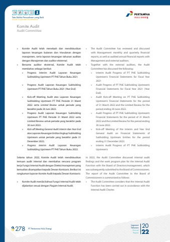 278 PT Pertamina Hulu Energi 2022Laporan TahunanAnnual ReportTata Kelola Perusahaan yang BaikGood Corporate Governance%u00bb Komite Audit telah menelaah dan mendiskusikanlaporan keuangan bulanan dan triwulanan denganmanajemen, serta laporan keuangan tahunan auditandengan Manajemen dan auditor eksternal. %u00bb Bersama auditor eksternal, Komite Audit telahmembahas sebagai berikut:%u00bb Progress Interim Audit Laporan KeuanganSubholding Upstream PT PHE Tahun Buku 2021.%u00bb Progress Audit Laporan Keuangan SubholdingUpstream PT PHE Tahun Buku 2021 (Year End).%u00bb Kick-off Meeting Audit atas Laporan KeuanganSubholding Upstream PT PHE Periode 31 Maret2022 serta Limited Review untuk periode yangberakhir pada 30 Juni 2022.%u00bb Progress Audit Laporan Keuangan SubholdingUpstream PT PHE Periode 31 Maret 2022 sertaLimited Review untuk periode yang berakhir pada30 Juni 2022.%u00bb Kick-off Meeting General Audit Interim dan Year End atas Laporan Keuangan Entitas lingkup Subholding Upstream untuk periode yang berakhir pada 31Desember 2022.%u00bb Progress Interim Audit Laporan KeuanganSubholding Upstream PT PHE Tahun Buku 2022.Selama tahun 2022, Komite Audit telah mendiskusikan temuan audit internal dan membahas rencana program kerja Fungsi Internal Audit dengan Direksi/manajemen yang kemudian disampaikan kepada Dewan Komisaris. Berikut ini rangkuman laporan Komite Audit kepada Dewan Komisaris:%u00bb Komite Audit menilai bahwa Fungsi Internal Audit telah dijalankan sesuai dengan Piagam Internal Audit. %u00bb The Audit Committee has reviewed and discussedwith Management monthly and quarterly financialreports, as well as audited annual financial reports with Management and external auditors.%u00bb Together with the external auditors, the AuditCommittee has discussed the following:%u00bb Interim Audit Progress of PT PHE SubholdingUpstream%u2019s Financial Statements for Fiscal Year2021%u00bb Audit Progress of PT PHE Subholding Upstream%u2019sFinancial Statements for Fiscal Year 2021 (YearEnd).%u00bb Audit Kick-off Meeting on PT PHE SubholdingUpstream%u2019s Financial Statements for the periodof 31 March 2022 and the Limited Review for theperiod ending 30 June 2022.%u00bb Audit Progress of PT PHE Subholding Upstream%u2019sFinancial Statements for the period of 31 March2022 and the Limited Review for the period ending 30 June 2022.%u00bb Kick-off Meeting of the Interim and Year EndGeneral Audit on Financial Statements ofSubholding Upstream Entities for the periodending 31 December 2022.%u00bb Interim Audit Progress of PT PHE SubholdingUpstream%u2019sIn 2022, the Audit Committee discussed internal audit findings and the work program plan for the Internal Audit Function with the Board of Directors/management, which was subsequently submitted to the Board of Commissioners. The report of the Audit Committee to the Board of Commissioners is summarized as follows:%u00bb The Audit Committee considers that the Internal AuditFunction has been carried out in accordance with theInternal Audit Charter.Audit CommitteeKomite Audit