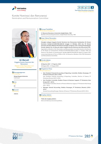 PT Pertamina Hulu Energi 285 2022Laporan TahunanAnnual ReportTata Kelola Perusahaan yang BaikGood Corporate GovernanceAri Marsudi Anggota Komite Nominasi dan RemunerasiMember of the Nomination and Remuneration CommitteeKewarganegaraanCitizenshipRiwayat PendidikanEducational BackgroundDasar Hukum PenunjukanLegal Basis of AppointmentPeriode JabatanTerm of OfficePengalaman KerjaWork ExperienceRangkap JabatanConcurrent PositionUsiaAgeDomisili DomicileWarga Negara Indonesia IndonesianS1 Ekonomi Akuntansi, Universitas Gadjah Mada, 1987.Bachelor of Accounting Economics, Gadjah Mada University, 1987.Diangkat sebagai Anggota Komite Nominasi dan Remunerasi berdasarkan SK Dewan Komisaris No.Kpts-013/DK-PHE/2020-S0 tanggal 12 Oktober 2020 dan SK Dewan Komisaris No.Kpts-008/DK-PHE/2020-S0 tanggal 24 Agustus 2021 tentang Perpanjangan Periode Jabatan Sdr. Ari Marsudi selaku Anggota Komite Nominasi dan Remunerasi PHE.Appointed as Member of the Nomination and Remuneration Committee based on the Decree of the Board of Commissioners No.Kpts-013/DK-PHE/2020-S0 dated 12 October 2020 and Decree of the Board of Commissioners No.Kpts-008/DK-PHE/2020-S0 dated 24 August 2021 concerning Extension of Term of Office of Mr. Ari Marsudi as Member of the PHE Nomination and Remuneration Committee.28 Agustus 2021 - 27 Agustus 202328 August 2021 - 27 August 2023%u00bb Vice President Financial Accounting & Reporting, Controller, Direktur Keuangan, PTPertamina (Persero) (2015%u20132018).Vice President Financial Accounting & Reporting, Controller, Director of Finance, PTPertamina (Persero) (2015%u20132018).%u00bb Vice President Controller, Direktur Finance & Business Support, PT Pertamina HuluEnergi (2011%u20132015).Vice President Controller, Director of Finance & Business Support, PT Pertamina Hulu Energi (2011%u20132015).%u00bb Manager General Accounting, Direktur Keuangan, PT Pertamina (Persero) (2010%u20132012).General Accounting Manager, Director of Finance, PT Pertamina (Persero) (2010%u20132012).Tidak ada rangkap jabatan.Does not hold any concurrent positions.60JakartaNomination and Remuneration CommitteeKomite Nominasi dan Remunerasi