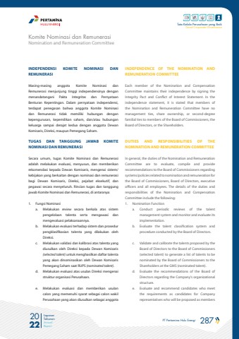 PT Pertamina Hulu Energi 287 2022Laporan TahunanAnnual ReportTata Kelola Perusahaan yang BaikGood Corporate GovernanceINDEPENDENSI KOMITE NOMINASI DAN REMUNERASIMasing-masing anggota Komite Nominasi dan Remunerasi menjunjung tinggi independensinya dengan menandatangani Pakta Integritas dan Pernyataan Benturan Kepentingan. Dalam pernyataan independensi, terdapat penegasan bahwa anggota Komite Nominasi dan Remunerasi tidak memiliki hubungan dengan kepengurusan, kepemilikan saham, dan/atau hubungan keluarga sampai derajat kedua dengan anggota Dewan Komisaris, Direksi, maupun Pemegang Saham. TUGAS DAN TANGGUNG JAWAB KOMITE NOMINASI DAN REMUNERASISecara umum, tugas Komite Nominasi dan Remunerasi adalah melakukan evaluasi, menyusun, dan memberikan rekomendasi kepada Dewan Komisaris, mengenai sistem/kebijakan yang berkaitan dengan nominasi dan remunerasi bagi Dewan Komisaris, Direksi, pejabat eksekutif, dan pegawai secara menyeluruh. Rincian tugas dan tanggung jawab Komite Nominasi dan Remunerasi, di antaranya: 1. Fungsi Nominasi a. Melakukan review secara berkala atas sistem pengelolaan talenta serta mengawasi dan mengevaluasi pelaksanaannya.b. Melakukan evaluasi terhadap sistem dan prosedur pengklasifikasian talenta yang dilakukan oleh Direksi.c. Melakukan validasi dan kalibrasi atas talenta yang diusulkan oleh Direksi kepada Dewan Komisaris (selected talent) untuk menghasilkan daftar talenta yang akan dinominasikan oleh Dewan Komisaris Pemegang Saham saat RUPS (nominated talent).d. Melakukan evaluasi atas usulan Direksi mengenai struktur organisasi Perusahaan.e. Melakukan evaluasi dan memberikan usulan calon yang memenuhi syarat sebagai calon wakil Perusahaan yang akan diusulkan sebagai anggota INDEPENDENCE OF THE NOMINATION AND REMUNERATION COMMITTEEEach member of the Nomination and Compensation Committee maintains their independence by signing the Integrity Pact and Conflict of Interest Statement. In the independence statement, it is stated that members of the Nomination and Remuneration Committee have no management ties, share ownership, or second-degree familial ties to members of the Board of Commissioners, the Board of Directors, or the Shareholders.DUTIES AND RESPONSIBILITIES OF THE NOMINATION AND REMUNERATION COMMITTEEIn general, the duties of the Nomination and Remuneration Committee are to evaluate, compile and provide recommendations to the Board of Commissioners regarding systems/policies related to nomination and remuneration for the Board of Commissioners, Board of Directors, executive officers and all employees. The details of the duties and responsibilities of the Nomination and Compensation Committee include the following:1. Nomination Functiona. Conduct periodic reviews of the talent management system and monitor and evaluate its implementation.b. Evaluate the talent classification system and procedure conducted by the Board of Directors.c. Validate and calibrate the talents proposed by the Board of Directors to the Board of Commissioners (selected talent) to generate a list of talents to be nominated by the Board of Commissioners to the Shareholders at the GMS (nominated talent).d. Evaluate the recommendations of the Board of Directors regarding the Company%u2019s organizational structure.e. Evaluate and recommend candidates who meet the requirements as candidates for Company representatives who will be proposed as members Nomination and Remuneration CommitteeKomite Nominasi dan Remunerasi