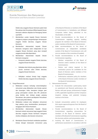 288 PT Pertamina Hulu Energi 2022Laporan TahunanAnnual ReportTata Kelola Perusahaan yang BaikGood Corporate GovernanceDireksi atau anggota Dewan Komisaris pada Anak Perusahaan dan Perusahaan Afiliasi kepada Dewan Komisaris sebelum diajukan ke Pemegang Saham saat RUPS.f. Memberikan usulan kepada Dewan Komisarismengenai program pengembangan kemampuananggota Direksi dan/atau anggota DewanKomisaris. g. Memberikan rekomendasi kepada DewanKomisaris mengenai calon independen di luaranggota Dewan Komisaris yang akan menjadianggota komite (bila diperlukan).h. Memberikan rekomendasi kepada DewanKomisaris mengenai:%u00bb Komposisi jabatan anggota Direksi dan/atauanggota Dewan Komisaris;%u00bb Kebijakan dan kriteria yang diperlukan dalam proses nominasi calon Direksi dan/atauanggota Dewan Komisaris;%u00bb Kebijakan evaluasi kinerja bagi anggotaDireksi dan/atau anggota Dewan Komisaris.2. Fungsi Remunerasi a. Melakukan evaluasi terhadap sistem/kebijakanremunerasi yang didasarkan atas kinerja operasidan keuangan, risiko, kewajaran dengan peer group, pencapaian sasaran atau KPI, peraturanyang berlaku dan strategi jangka panjangPerusahaan, dan potensi pendapatan Perusahaandi masa yang akan datang.b. Melakukan evaluasi atas kebijakan remunerasibagi pekerja yang membutuhkan persetujuan/tanggapan dari Dewan Komisaris.c. Memberikan rekomendasi kepada DewanKomisaris terkait remunerasi bagi anggota Direksidan/atau anggota Dewan Komisaris mengenaistruktur, kebijakan, dan besaran remunerasi. d. Membantu Dewan Komisaris melakukan penilaian kinerja dengan kesesuaian remunerasi yangof the Board of Directors or members of the Board of Commissioners in Subsidiaries and Affiliated Companies before being submitted to the Shareholders at the GMS.f. Provide recommendations to the Board ofCommissioners regarding capacity buildingprograms for members of the Board of Directorsand/or members of the Board of Commissioners.g. Make recommendations to the Board ofCommissioners on independent candidatesoutside of the Board of Commissioners who willserve as member of the committee (if needed).h. Provide recommendations to the Board ofCommissioners regarding:%u00bb Member composition of the Board ofDirectors and/or members of the Board ofCommissioners;%u00bb Policies and criteria required in thenomination process for candidates for theBoard of Directors and/or members of theBoard of Commissioners;%u00bb Performance evaluation policy for membersof the Board of Directors and/or members ofthe Board of Commissioners.2. Remuneration Functiona. Evaluate the remuneration system/policy basedon operational and financial performance, risk,fairness with peer groups, achievement of targetsor KPIs, applicable regulations and the Company%u2019slongterm strategy, and potential Companyrevenue in the future.b. Evaluate remuneration policies for employeesthat require approval/response from the Board ofCommissioners.c. Provide recommendations to the Board ofCommissioners regarding remuneration formembers of the Board of Directors and/ormembers of the Board of Commissioners regarding the structure, policies, and remuneration value.d. Assisting the Board of Commissioners inperformance assessments in accordance with theNomination and Remuneration CommitteeKomite Nominasi dan Remunerasi
