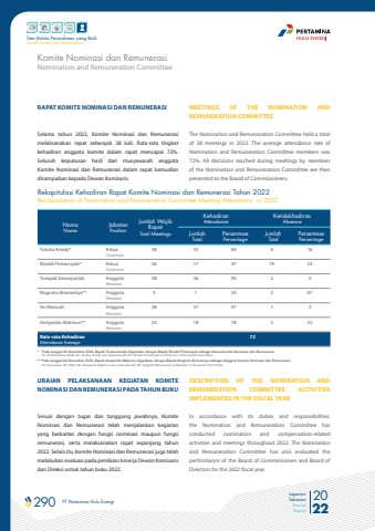 290 PT Pertamina Hulu Energi 2022Laporan TahunanAnnual ReportTata Kelola Perusahaan yang BaikGood Corporate GovernanceRAPAT KOMITE NOMINASI DAN REMUNERASISelama tahun 2022, Komite Nominasi dan Remunerasi melaksanakan rapat sebanyak 38 kali. Rata-rata tingkat kehadiran anggota komite dalam rapat mencapai 72%. Seluruh keputusan hasil dari musyawarah anggota Komite Nominasi dan Remunerasi dalam rapat kemudian disampaikan kepada Dewan Komisaris.NamaNameJabatanPositionJumlah Wajib RapatTotal MeetingsKehadiranAttendance KetidakhadiranAbsenceJumlahTotalPersentase PercentageJumlahTotalPersentase PercentageTutuka Ariadji* KetuaChairman38 32 84 6 16Rinaldi Firmansyah* KetuaChairman36 17 47 19 53Tumpak Simanjuntak AnggotaMember38 36 95 2 5Nugroho Bramantyo** AnggotaMember3 1 33 2 67Ari Marsudi AnggotaMember38 37 97 1 3Areiyando Makmun** AnggotaMember23 18 78 5 22Rata-rata Kehadiran Attendance Average72Rekapitulasi Kehadiran Rapat Komite Nominasi dan Remunerasi Tahun 2022Recapitulation of Nomination and Remuneration Committee Meeting Attendance in 2022* Pada tanggal 24 November 2022, Bapak Tutuka Ariadji digantikan dengan Bapak Rinaldi Firmansyah sebagai Ketua Komite Nominasi dan Remunerasi On 24 November 2022, Mr. Tutuka Ariadji was replaced with Mr. Rinaldi Firmansyah as Chairman of the Audit Committee.** Pada tanggal 24 November 2022, Bapak Areiyando Makmun digantikan dengan Bapak Nugroho Bramantyo sebagai Anggota Komite Nominasi dan Remunerasi On November 24, 2022, Mr. Areiyando Makmun was replaced with Mr. Nugroho Bramantyo as Member of the Audit Committee.URAIAN PELAKSANAAN KEGIATAN KOMITE NOMINASI DAN REMUNERASI PADA TAHUN BUKUSesuai dengan tugas dan tanggung jawabnya, Komite Nominasi dan Remunerasi telah menjalankan kegiatan yang berkaitan dengan fungsi nominasi maupun fungsi remunerasi, serta melaksanakan rapat sepanjang tahun 2022. Selain itu, Komite Nominasi dan Remunerasi juga telah melakukan evaluasi pada penilaian kinerja Dewan Komisaris dan Direksi untuk tahun buku 2022.MEETINGS OF THE NOMINATION AND REMUNERATION COMMITTEEThe Nomination and Remuneration Committee held a total of 38 meetings in 2022. The average attendance rate of Nomination and Remuneration Committee members was 72%. All decisions reached during meetings by members of the Nomination and Remuneration Committee are then presented to the Board of Commissioners.DESCRIPTION OF THE NOMINATION AND REMUNERATION COMMITTEE ACTIVITIES IMPLEMENTED IN THE FISCAL YEARIn accordance with its duties and responsibilities, the Nomination and Remuneration Committee has conducted nomination and compensation-related activities and meetings throughout 2022. The Nomination and Remuneration Committee has also evaluated the performance of the Board of Commissioners and Board of Directors for the 2022 fiscal year.Nomination and Remuneration CommitteeKomite Nominasi dan Remunerasi