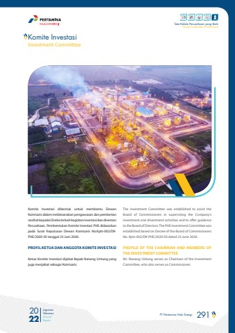 PT Pertamina Hulu Energi 291 2022Laporan TahunanAnnual ReportTata Kelola Perusahaan yang BaikGood Corporate GovernanceKomite Investasi dibentuk untuk membantu Dewan Komisaris dalam melaksanakan pengawasan dan pemberian nasihat kepada Direksi terkait kegiatan investasi dan divestasi Perusahaan. Pembentukan Komite Investasi PHE didasarkan pada Surat Keputusan Dewan Komisaris No.Kpts-002/DKPHE/2020-S0 tanggal 23 Juni 2020.PROFIL KETUA DAN ANGGOTA KOMITE INVESTASIKetua Komite Investasi dijabat Bapak Nanang Untung yang juga menjabat sebagai Komisaris. The Investment Committee was established to assist the Board of Commissioners in supervising the Company%u2019s investment and divestment activities and to offer guidance to the Board of Directors. The PHE Investment Committee was established based on Decree of the Board of Commissioners No. Kpts-002/DK-PHE/2020-S0 dated 23 June 2020.PROFILE OF THE CHAIRMAN AND MEMBERS OF THE INVESTMENT COMMITTEEMr. Nanang Untung serves as Chairman of the Investment Committee, who also serves as Commissioner.Komite InvestasiInvestment Committee