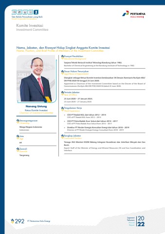292 PT Pertamina Hulu Energi 2022Laporan TahunanAnnual ReportTata Kelola Perusahaan yang BaikGood Corporate GovernanceNanang UntungKetua Komite InvestasiChairman of Investment CommitteeKewarganegaraanCitizenshipRiwayat PendidikanEducational BackgroundDasar Hukum PenunjukanLegal Basis of AppointmentPeriode JabatanTerm of OfficePengalaman KerjaWork ExperienceRangkap JabatanConcurrent PositionUsiaAgeDomisili DomicileWarga Negara Indonesia IndonesianSarjana Teknik Kimia di Institut Teknologi Bandung tahun 1982.Bachelor of Chemical Engineering at the Bandung Institute of Technology in 1982.Diangkat sebagai Ketua Komite Investasi berdasarkan SK Dewan Komisaris No.Kpts-002/DK-PHE/2020-S0 tanggal 23 Juni 2020.Appointed as Chairman of the Investment Committee based on the Decree of the Board of Commissioners No.Kpts-002/DK-PHE/2020-S0 dated 23 June 2020.23 Juni 2020 %u2013 27 Januari 2023.23 June 2020 %u2013 27 January 2023%u00bb CEO PT Badak NGL dari tahun 2012 %u2013 2014CEO of PT Badak NGL from 2012 %u2013 2014%u00bb CEO PT Patra Badak Arun Solusi dari tahun 2014 %u2013 2017CEO of PT Patra Badak Arun Solusi from 2014 %u2013 2017%u00bb Direktur PT Rinder Energia Konsultan Energi dari tahun 2018 %u2013 2019Director of PT Rinder Energia Energy Consultant from 2018 - 2019Tenaga Ahli Menteri ESDM Bidang Integrasi Koordinasi dan Interface Minyak dan Gas Bumi.Expert Staff of the Minister of Energy and Mineral Resources Oil and Gas Coordination and Interface.64TangerangNama, Jabatan, dan Riwayat Hidup Singkat Anggota Komite InvestasiName, Position, and Brief Profile of Members of the Investment CommitteeInvestment CommitteeKomite Investasi