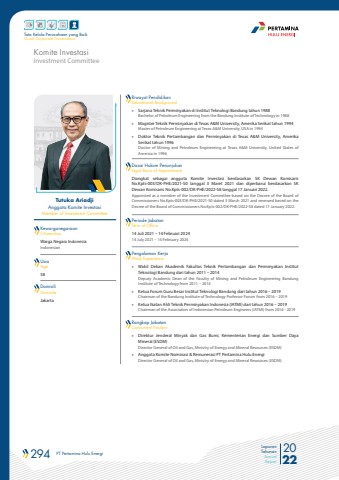 294 PT Pertamina Hulu Energi 2022Laporan TahunanAnnual ReportTata Kelola Perusahaan yang BaikGood Corporate GovernanceTutuka AriadjiAnggota Komite InvestasiMember of Investment CommitteeKewarganegaraanCitizenshipRiwayat PendidikanEducational BackgroundDasar Hukum PenunjukanLegal Basis of AppointmentPeriode JabatanTerm of OfficePengalaman KerjaWork ExperienceRangkap JabatanConcurrent PositionUsiaAgeDomisili DomicileWarga Negara Indonesia Indonesian%u00bb Sarjana Teknik Perminyakan di Institut Teknologi Bandung tahun 1988Bachelor of Petroleum Engineering from the Bandung Institute of Technology in 1988%u00bb Magister Teknik Perminyakan di Texas A&M University, Amerika Serikat tahun 1994Master of Petroleum Engineering at Texas A&M University, USA in 1994%u00bb Doktor Teknik Pertambangan dan Perminyakan di Texas A&M University, Amerika Serikat tahun 1996Doctor of Mining and Petroleum Engineering at Texas A&M University, United States of America in 1996Diangkat sebagai anggota Komite Investasi berdasarkan SK Dewan Komisaris No.Kpts-003/DK-PHE/2021-S0 tanggal 3 Maret 2021 dan diperbarui berdasarkan SK Dewan Komisaris No.Kpts-002/DK-PHE/2022-S8 tanggal 17 Januari 2022.Appointed as a member of the Investment Committee based on the Decree of the Board of Commissioners No.Kpts-003/DK-PHE/2021-S0 dated 3 March 2021 and renewed based on the Decree of the Board of Commissioners No.Kpts-002/DK-PHE/2022-S8 dated 17 January 2022.14 Juli 2021 %u2013 14 Februari 2024 14 July 2021 %u2013 14 February 2024%u00bb Wakil Dekan Akademik Fakultas Teknik Pertambangan dan Perminyakan Institut Teknologi Bandung dari tahun 2011 %u2013 2014Deputy Academic Dean of the Faculty of Mining and Petroleum Engineering Bandung Institute of Technology from 2011 %u2013 2014%u00bb Ketua Forum Guru Besar Institut Teknologi Bandung dari tahun 2016 %u2013 2019Chairman of the Bandung Institute of Technology Professor Forum from 2016 %u2013 2019%u00bb Ketua Ikatan Ahli Teknik Perminyakan Indonesia (IATMI) dari tahun 2016 %u2013 2019Chairman of the Association of Indonesian Petroleum Engineers (IATMI) from 2016 - 2019%u00bb Direktur Jenderal Minyak dan Gas Bumi, Kementerian Energi dan Sumber Daya Mineral (ESDM)Director General of Oil and Gas, Ministry of Energy and Mineral Resources (ESDM)%u00bb Anggota Komite Nominasi & Remunerasi PT Pertamina Hulu EnergiDirector General of Oil and Gas, Ministry of Energy and Mineral Resources (ESDM)58JakartaInvestment CommitteeKomite Investasi