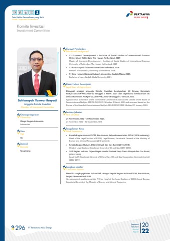 296 PT Pertamina Hulu Energi 2022Laporan TahunanAnnual ReportTata Kelola Perusahaan yang BaikGood Corporate GovernanceSafriansyah Yanwar RosyadiAnggota Komite InvestasiMember of Investment CommitteeKewarganegaraanCitizenshipRiwayat PendidikanEducational BackgroundDasar Hukum PenunjukanLegal Basis of AppointmentPeriode JabatanTerm of OfficePengalaman KerjaWork ExperienceRangkap JabatanConcurrent PositionUsiaAgeDomisili DomicileWarga Negara Indonesia Indonesian%u00bb S2 Economic Development %u2013 Institute of Social Studies of International Erasmus University of Rotterdam, The Hague, Netherland, 2009Master of Economic Development %u2013 Institute of Social Studies of International Erasmus University of Rotterdam, The Hague, Netherland, 2009%u00bb S2 Pascasarjana Ekonomi Universitas Indonesia, 2008.Masters of Economics, University of Indonesia, 2008.%u00bb S1 Ilmu Hukum (Sarjana Hukum), Universitas Gadjah Mada, 2001.Bachelor of Laws, Gadjah Mada University, 2001.Diangkat sebagai anggota Komite Investasi berdasarkan SK Dewan Komisaris No.Kpts-003/DK-PHE/2021-S0 tanggal 3 Maret 2021 dan diperbarui berdasarkan SK Dewan Komisaris No.Kpts-002/DK-PHE/2022-S8 tanggal 17 Januari 2022.Appointed as a member of the Investment Committee based on the Decree of the Board of Commissioners No.Kpts-003/DK-PHE/2021-S0 dated 3 March 2021 and renewed based on the Decree of the Board of Commissioners No.Kpts-002/DK-PHE/2022-S8 dated 17 January 2022.24 November 2022 %u2013 30 November 2023.24 November 2022 %u2013 30 November 2023.%u00bb Kepala Bagian Hukum ESDM, Biro Hukum, Setjen Kementerian ESDM (2018-sekarang).Head of the Legal Section of ESDM, Legal Bureau, Secretariat General of the Ministry of Energy and Mineral Resources (2018-present).%u00bb Kepala Bagian Hukum, Ditjen Minyak dan Gas Bumi (2015-2018).Head of Legal Section, Directorate General of Oil and Gas (2015-2018).%u00bb Staf Bagian Hukum, Ditjen Migas (Analis Kontrak Kerja Sama Minyak dan Gas Bumi) (2002-2011).Legal Staff, Directorate General of Oil and Gas (Oil and Gas Cooperation Contract Analyst) (2002-2011).Memiliki rangkap jabatan di luar PHE sebagai Kepala Bagian Hukum ESDM, Biro Hukum, Setjen Kementerian ESDM.Has concurrent positions outside PHE as Head of the Legal Section of ESDM, Legal Bureau, Secretariat General of the Ministry of Energy and Mineral Resources.46TangerangInvestment CommitteeKomite Investasi
