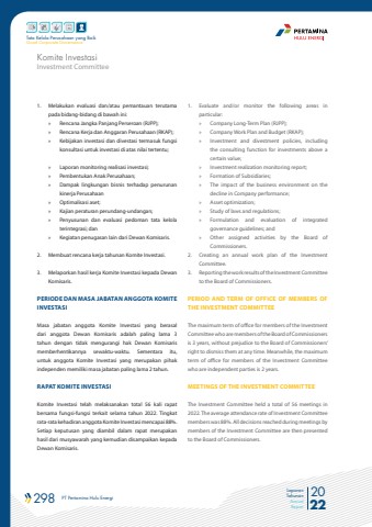 298 PT Pertamina Hulu Energi 2022Laporan TahunanAnnual ReportTata Kelola Perusahaan yang BaikGood Corporate Governance1. Melakukan evaluasi dan/atau pemantauan terutama pada bidang-bidang di bawah ini:%u00bb Rencana Jangka Panjang Perseroan (RJPP); %u00bb Rencana Kerja dan Anggaran Perusahaan (RKAP);%u00bb Kebijakan investasi dan divestasi termasuk fungsi konsultasi untuk investasi di atas nilai tertentu;%u00bb Laporan monitoring realisasi investasi;%u00bb Pembentukan Anak Perusahaan;%u00bb Dampak lingkungan bisnis terhadap penurunan kinerja Perusahaan%u00bb Optimalisasi aset;%u00bb Kajian peraturan perundang-undangan;%u00bb Penyusunan dan evaluasi pedoman tata kelola terintegrasi; dan%u00bb Kegiatan penugasan lain dari Dewan Komisaris.2. Membuat rencana kerja tahunan Komite Investasi.3. Melaporkan hasil kerja Komite Investasi kepada Dewan Komisaris.PERIODE DAN MASA JABATAN ANGGOTA KOMITE INVESTASIMasa jabatan anggota Komite Investasi yang berasal dari anggota Dewan Komisaris adalah paling lama 3 tahun dengan tidak mengurangi hak Dewan Komisaris memberhentikannya sewaktu-waktu. Sementara itu, untuk anggota Komite Investasi yang merupakan pihak independen memiliki masa jabatan paling lama 2 tahun.RAPAT KOMITE INVESTASIKomite Investasi telah melaksanakan total 56 kali rapat bersama fungsi-fungsi terkait selama tahun 2022. Tingkat rata-rata kehadiran anggota Komite Investasi mencapai 88%. Setiap keputusan yang diambil dalam rapat merupakan hasil dari musyawarah yang kemudian disampaikan kepada Dewan Komisaris.1. Evaluate and/or monitor the following areas in particular:%u00bb Company Long-Term Plan (RJPP);%u00bb Company Work Plan and Budget (RKAP);%u00bb Investment and divestment policies, including the consulting function for investments above a certain value;%u00bb Investment realization monitoring report;%u00bb Formation of Subsidiaries;%u00bb The impact of the business environment on the decline in Company performance;%u00bb Asset optimization;%u00bb Study of laws and regulations;%u00bb Formulation and evaluation of integrated governance guidelines; and%u00bb Other assigned activities by the Board of Commissioners.2. Creating an annual work plan of the Investment Committee.3. Reporting the work results of the Investment Committee to the Board of Commissioners.PERIOD AND TERM OF OFFICE OF MEMBERS OF THE INVESTMENT COMMITTEEThe maximum term of office for members of the Investment Committee who are members of the Board of Commissioners is 3 years, without prejudice to the Board of Commissioners%u2019 right to dismiss them at any time. Meanwhile, the maximum term of office for members of the Investment Committee who are independent parties is 2 years.MEETINGS OF THE INVESTMENT COMMITTEEThe Investment Committee held a total of 56 meetings in 2022. The average attendance rate of Investment Committee members was 88%. All decisions reached during meetings by members of the Investment Committee are then presented to the Board of Commissioners.Investment CommitteeKomite Investasi