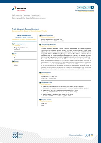 PT Pertamina Hulu Energi 301 2022Laporan TahunanAnnual ReportTata Kelola Perusahaan yang BaikGood Corporate GovernanceDewi FarahastutiSekretaris Dewan KomisarisSecretary of the Board of CommissionersKewarganegaraanCitizenshipRiwayat PendidikanEducational BackgroundDasar Hukum PenunjukanLegal Basis of AppointmentPeriode JabatanTerm of OfficePengalaman KerjaWork ExperienceRangkap JabatanConcurrent PositionUsiaAgeDomisili DomicileWarga Negara Indonesia IndonesianSarjana Ekonomi, STIE Perbanas, 2001.Bachelor of Economics, STIE Perbanas, 2001.Diangkat sebagai Sekretaris Dewan Komisaris berdasarkan SK Dewan Komisaris No.Kpts-017/DK-PHE/2018 tanggal 16 April 2018 dan Surat Penegasan Periode Masa Jabatan Sekretaris Dewan Komisaris melalui Surat Komisaris No. 061/DK-PHE/2019 tanggal 01 Oktober 2019 tentang Penegasan Periode Masa Jabatan Sekretaris Dewan Komisaris, serta SK Dewan Komisaris No.Kpts-004/DK-PHE/2021-S8 tanggal 26 Maret 2021 tentang Pengangkatan Kembali sebagai Sekretaris Dewan Komisaris Periode ke-2.Appointed as Secretary to the Board of Commissioners based on the Decree of the Board of Commissioners No.Kpts-017/DK-PHE/2018 dated 16 April 2018 and the Letter of Confirmation of the Term of Office of the Secretary to the Board of Commissioners through the Commissioner%u2019s Letter No. 061/DK-PHE/2019 dated 01 October 2019 concerning Affirmation of the Term of Office of the Secretary to the Board of Commissioners, as well as Decree of the Board of Commissioners No.Kpts-004/DK-PHE/2021-S8 dated 26 March 2021 concerning Reappointment as Secretary to the Board of Commissioners for the 2nd Period -2.16 April 2021 %u2013 15 April 202316 April 2021 %u2013 15 April 2023%u00bb Sekretaris Dewan Komisaris PT Pertamina Hulu Energi (2018 %u2013 sekarang)Secretary to the Board of Commissioners of PT Pertamina Hulu Energi (2018 %u2013 present)%u00bb Sekretaris VP HR & GA PT Pertamina Hulu Energi (2013 %u2013 2018)Secretary of VP HR & GA PT Pertamina Hulu Energi (2013 %u2013 2018)%u00bb Staff HR & GA PT Pertamina Hulu Energi (2012 %u2013 2013)Staff HR & GA PT Pertamina Hulu Energi (2012 %u2013 2013)Tidak ada.None.47BekasiProfil Sekretaris Dewan KomisarisSecretary of the Board of Commissioners' ProfileSecretary of the Board of CommissionersSekretaris Dewan Komisaris