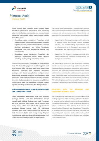 PT Pertamina Hulu Energi 307 2022Laporan TahunanAnnual ReportTata Kelola Perusahaan yang BaikGood Corporate GovernanceFungsi Internal Audit memiliki peran strategis dalam mendukung pelaksanaan pengawasan serta berwenang untuk memberikan jasa assurance dan non-assurance secara independen dan objektif. Peran Internal Audit memiliki fokus utama, yaitu:%u00bb Mendukung upaya manajemen Perusahaan untuk mencapai tujuan, visi, dan misi yang ditetapkan melalui kegiatan assurance, serta merekomendasikan perbaikan dan/atau peningkatan tata kelola Perusahaan, manajemen risiko, dan pengendalian internal yang baik/memadai.%u00bb Mendukung upaya manajemen Perusahaan dan Pemangku Kepentingan lainnya melalui kegiatan consulting, counter parting, dan strategic advisor.Lingkup atas jasa assurance yang diberikan Fungsi Internal Audit PHE Subholding Upstream melalui kegiatan audit yang berbasis risiko (risk-based audit) atas proses bisnis Perusahaan, kepatuhan pada ketentuan perundangundangan, dan standar yang berlaku, meliputi namun tidak terbatas pada audit keuangan, audit kepatuhan, audit operasional, audit investigasi, dan audit teknologi informasi. Sementara lingkup atas jasa non-assurance yang diberikan Fungsi Internal Audit PHE Subholding Upstream meliputi kegiatan consulting, counterparting, dan strategic advisor. HUBUNGAN DENGAN INTERNAL AUDIT REGIONAL DAN ANAK PERUSAHAANDalam menjalankan kewenangan, tugas, dan tanggung jawabnya, Internal Audit PHE berkoordinasi dengan Internal Audit Holding, Regional, dan Anak Perusahaan SHU. Pola hubungan diatur dalam Piagam Internal Audit masing-masing entitas. Internal Audit PHE juga melakukan pembinaan kepada Internal Audit PHE Subholding Upstream. Untuk profil Chief Audit Executive Regional dan Anak Perusahaan dijabat oleh masing-masing Pimpinan Fungsi Internal Audit yang dapat dilihat pada bagian Profil Chief Audit Executive Regional dan Anak Perusahaan.The Internal Audit function plays a strategic role in assisting with supervision implementation and is authorized to provide assurance and non-assurance services independently and objectively. The primary focus of Internal Audit is as follows:%u00bb Supporting the Company%u2019s management in achieving its purpose, vision, and mission through assurance activities, and recommending improvements and/or enhancements to the Company%u2019s governance, risk management, and adequate/good internal control.%u00bb Supporting the Company%u2019s management and other Stakeholders through consulting, counter parting, and strategic advisor activities.The Internal Audit Function of PHE Subholding Upstream provides assurance services through risk-based audits of the Company%u2019s business processes, compliance with statutory provisions, and applicable standards; which include, but are not limited to, financial audits, audit compliance, operational audit, investigative audit, and information technology audit. Meanwhile, the scope of non-assurance services provided by PHE Subholding Upstream%u2019s Internal Audit Function includes consulting, counterparting, and strategic advisor activities.RELATIONS WITH THE REGIONAL AND SUBSIDIARY INTERNAL AUDITPHE%u2019s Internal Audit coordinates with the Internal Audit of the Holding, Regionals, and Subholding Upstream Subsidiaries in carrying out its authority, duties, and responsibilities. Each entity%u2019s Internal Audit Charter governs the relationship pattern. Furthermore, PHE%u2019s Internal Audit advises the Internal Audit of Regionals and Subsidiaries. The profiles of the Regional and Subsidiary Chief Audit Executives are occupied by each respective Chief Audit Executive, which can be found on the Profiles of the Regional and Subsidiary Chief Audit Executives.Internal AuditInternal Audit