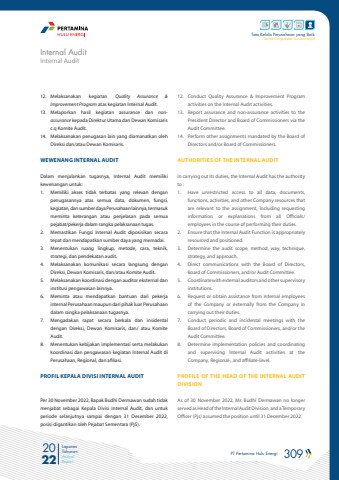 PT Pertamina Hulu Energi 309 2022Laporan TahunanAnnual ReportTata Kelola Perusahaan yang BaikGood Corporate Governance12. Melaksanakan kegiatan Quality Assurance & Improvement Program atas kegiatan Internal Audit.13. Melaporkan hasil kegiatan assurance dan nonassurance kepada Direktur Utama dan Dewan Komisaris c.q Komite Audit.14. Melaksanakan penugasan lain yang diamanatkan oleh Direksi dan/atau Dewan Komisaris.WEWENANG INTERNAL AUDITDalam menjalankan tugasnya, Internal Audit memiliki kewenangan untuk:1. Memiliki akses tidak terbatas yang relevan dengan penugasannya atas semua data, dokumen, fungsi, kegiatan, dan sumber daya Perusahaan lainnya, termasuk meminta keterangan atau penjelasan pada semua pejabat/pekerja dalam rangka pelaksanaan tugas.2. Memastikan Fungsi Internal Audit diposisikan secara tepat dan mendapatkan sumber daya yang memadai.3. Menentukan ruang lingkup, metode, cara, teknik, strategi, dan pendekatan audit.4. Melaksanakan komunikasi secara langsung dengan Direksi, Dewan Komisaris, dan/atau Komite Audit.5. Melaksanakan koordinasi dengan auditor eksternal dan institusi pengawasan lainnya.6. Meminta atau mendapatkan bantuan dari pekerja internal Perusahaan maupun dari pihak luar Perusahaan dalam rangka pelaksanaan tugasnya.7. Mengadakan rapat secara berkala dan insidental dengan Direksi, Dewan Komisaris, dan/ atau Komite Audit.8. Menentukan kebijakan implementasi serta melakukan koordinasi dan pengawasan kegiatan Internal Audit di Perusahaan, Regional, dan afiliasi.PROFIL KEPALA DIVISI INTERNAL AUDITPer 30 November 2022, Bapak Budhi Dermawan sudah tidak menjabat sebagai Kepala Divisi Internal Audit, dan untuk periode selanjutnya sampai dengan 31 Desember 2022, posisi digantikan oleh Pejabat Sementara (PjS).12. Conduct Quality Assurance & Improvement Program activities on the Internal Audit activities.13. Report assurance and non-assurance activities to the President Director and Board of Commissioners via the Audit Committee.14. Perform other assignments mandated by the Board of Directors and/or Board of Commissioners.AUTHORITIES OF THE INTERNAL AUDITIn carrying out its duties, the Internal Audit has the authority to :1. Have unrestricted access to all data, documents, functions, activities, and other Company resources that are relevant to the assignment, including requesting information or explanations from all Officials/employees in the course of performing their duties.2. Ensure that the Internal Audit Function is appropriately resourced and positioned.3. Determine the audit scope, method, way, technique, strategy, and approach.4. Direct communications with the Board of Directors, Board of Commissioners, and/or Audit Committee.5. Coordinate with external auditors and other supervisory institutions.6. Request or obtain assistance from internal employees of the Company or externally from the Company in carrying out their duties.7. Conduct periodic and incidental meetings with the Board of Directors, Board of Commissioners, and/or the Audit Committee.8. Determine implementation policies and coordinating and supervising Internal Audit activities at the Company, Regional-, and affiliate-level.PROFILE OF THE HEAD OF THE INTERNAL AUDIT DIVISIONAs of 30 November 2022, Mr. Budhi Dermawan no longer served as Head of the Internal Audit Division, and a Temporary Officer (Pjs) assumed the position until 31 December 2022.Internal AuditInternal Audit