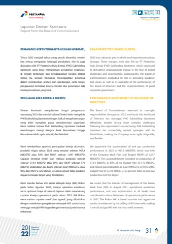 PT Pertamina Hulu Energi 31 2022Laporan TahunanAnnual ReportLaporan ManajemenManagement ReportReport from the Board of CommissionersLaporan Dewan KomisarisPEMANGKU KEPENTINGAN YANG KAMI HORMATI,Tahun 2022 menjadi tahun yang penuh dinamika, setelah kita semua mengalami berbagai perubahan. Hal ini juga dirasakan oleh PT Pertamina Hulu Energi (PHE) Subholding Upstream yang terus memperkuat perubahan organisasi di tengah tantangan dan ketidakpastian kondisi global. Untuk itu, Dewan Komisaris meningkatkan perannya dalam memberikan arahan dan pandangan, serta fungsi pengawasan terhadap kinerja Direksi dan penerapan tata kelola perusahaan yang baik. PENILAIAN ATAS KINERJA DIREKSIDewan Komisaris menjalankan fungsi pengawasan sepanjang 2022 dan menilai bahwa Direksi telah mengelola PHE Subholding Upstream dengan baik, di tengah tantangan yang lebih kompleks pasca restrukturisasi organisasi. Kami melihat bahwa PHE Subholding Upstream berhasil membangun sinergi dengan Anak Perusahaan hingga Perusahaan lebih agile, adaptif, dan fleksibel. Kami memberikan apresiasi pencapaian kinerja akumulasi produksi migas tahun 2022 yang tercatat sebesar 967,4 MBOEPD atau 92% dari RKAP sebesar 1.047 MBOEPD. Capaian tersebut terdiri dari realisasi produksi minyak sebesar 514,4 MBOPD atau 89% dari RKAP sebesar 576 MBOPD, sedangkan gas bumi sebesar 2.624 MMSCFD, atau 96% dari RKAP 2.726 MMSCFD. Secara umum total produksi migas mencapai target yang ditetapkan. Kami menilai bahwa alih kelola Wilayah Kerja (WK) Rokan pada bulan Agustus 2021, kinerja operation excellence, serta optimasi biaya di seluruh lapisan telah mendukung capaian kinerja operasional pada tahun 2022. WK Rokan mencatatkan capaian masif dan agresif, yang dibuktikan dengan melakukan pengeboran sebanyak 403 sumur baru, sehingga menjadi WK migas dengan investasi jumlah sumur terbanyak.DEAR RESPECTED STAKEHOLDERS,2022 was a dynamic year in which we all experienced various changes. These changes were also felt by PT Pertamina Hulu Energi (PHE) Subholding Upstream, which continued to strengthen organizational change in the face of global challenges and uncertainties. Subsequently, the Board of Commissioners expanded its role in providing guidance and views, as well as its oversight of the performance of the Board of Directors and the implementation of good corporate governance.PERFORMANCE ASSESSMENT OF THE BOARD OF DIRECTORSThe Board of Commissioners exercised its oversight responsibilities throughout 2022 and found that the Board of Directors has managed PHE Subholding Upstream effectively, despite facing more complex challenges following the organization's restructuring. PHE Subholding Upstream has successfully created synergies with its Subsidiaries, making the Company more agile, adaptable, and flexible.We appreciate the accumulated oil and gas production performance in 2022 of 967.4 MBOEPD, which was 92% of the Company Work Plan and Budget (RKAP) of 1,047 MBOEPD. This accomplishment included oil production of 514.4 MBOPD, or 89% of the Budget Plan of 576 MBOPD, and natural gas production of 2,624 MMSCFD, or 96% of the Budget Plan of 2,724 MMSCFD. In general, total oil and gas production met the target.We assess that the transfer of management of the Rokan Work Area (WK) in August 2021, operational excellence performance, and cost optimization at all levels have contributed to the achievement of operational performance in 2022. The Rokan WK achieved massive and aggressive results, as evidenced by the drilling of 403 new wells, making it the oil and gas WK with the most wells invested.