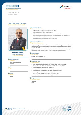 310 PT Pertamina Hulu Energi 2022Laporan TahunanAnnual ReportTata Kelola Perusahaan yang BaikGood Corporate GovernanceBudhi DermawanChief Audit ExecutiveChief Audit ExecutiveKewarganegaraanCitizenshipRiwayat PendidikanEducational BackgroundDasar Hukum PenunjukanLegal Basis of AppointmentPeriode JabatanTerm of OfficePengalaman KerjaWork ExperienceRangkap JabatanConcurrent PositionUsiaAgeDomisili DomicileWarga Negara Indonesia Indonesian%u00bb S2 Magister Hukum, Universitas Islam Jakarta, 2015Master of Law, Jakarta Islamic University, 2015%u00bb S1 Ekonomi Akuntansi, Universitas Persada Indonesia YAI %u2013 Jakarta, 1995Bachelor of Accounting Economics, University of Persada Indonesia YAI %u2013 Jakarta, 1995%u00bb D3 Ekonomi Akuntansi STAN %u2013 Jakarta, 1988Diploma of Accounting Economics STAN %u2013 Jakarta, 1988Diangkat sebagai Chief Audit Executive berdasarkan Surat Keputusan SVP Human Capital Management PT Pertamina (Persero) No. SKMJ-00696/K20100/2020-S8 tanggal 24 September 2020. Appointed as Chief Audit Executive based on PT Pertamina (Persero) SVP Human Capital Management Decree No. SKMJ-00696/K20100/2020-S8 dated 24 September 2020.Oktober 2020 %u2013 November 2022 October 2020 %u2013 November 2022 %u00bb Chief Audit Executive Subholding PHE, Oktober 2020 %u2013 30 November 2022Chief Audit Executive Subholding PHE, Oktober 2020 %u2013 30 November 2022%u00bb VP Internal Audit PT Pertamina EP, 2019-2020VP Internal Audit PT Pertamina EP, 2019-2020%u00bb VP Investigation Audit & WBS PT Pertamina (Persero), 2015%u20132019 VP Investigation Audit & WBS PT Pertamina (Persero), 2015%u20132019 %u00bb Chief Internal Audit PT Pertamina Hulu Energi, 2014%u20132015 Chief Internal Audit PT Pertamina Hulu Energi, 2014%u20132015 Tidak ada.None.56JakartaProfil Chief Audit ExecutiveChief Audit Executive's ProfileInternal AuditInternal Audit