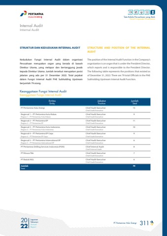 PT Pertamina Hulu Energi 311 2022Laporan TahunanAnnual ReportTata Kelola Perusahaan yang BaikGood Corporate GovernanceSTRUCTURE AND POSITION OF THE INTERNAL AUDITThe position of the Internal Audit Function in the Company%u2019s organization is an organ that is under the President Director, which reports and is responsible to the President Director. The following table represents the positions that existed as of December 31, 2022. There are 79 total Officials in the PHE Subholding Upstream Internal Audit Function.STRUKTUR DAN KEDUDUKAN INTERNAL AUDIT Kedudukan Fungsi Internal Audit dalam organisasi Perusahaan merupakan organ yang berada di bawah Direktur Utama, yang melapor dan bertanggung jawab kepada Direktur Utama. Jumlah tersebut merupakan posisi jabatan yang ada per 31 Desember 2022. Total pejabat dalam Fungsi Internal Audit PHE Subholding Upstream berjumlah 79 orang.EntitasEntityJabatanPositionJumlahTotalPT Pertamina Hulu Energi Chief Audit ExecutiveChief Audit Executive13Regional 1 %u2013 PT Pertamina Hulu RokanRegion 1 %u2013 PT Pertamina Hulu RokanChief Audit ExecutiveChief Audit Executive9Regional 2 %u2013 PT Pertamina EPRegion 2 %u2013 PT Pertamina EPChief Audit ExecutiveChief Audit Executive11Regional 3 %u2013 PT Pertamina Hulu IndonesiaRegion 3 %u2013 PT Pertamina Hulu IndonesiaChief Audit ExecutiveChief Audit Executive10Regional 4 %u2013 PT Pertamina EP CepuRegion 4 %u2013 PT Pertamina EP CepuChief Audit ExecutiveChief Audit Executive9Regional 5 %u2013 PT Pertamina International EPRegion 5 %u2013 PT Pertamina International EPChief Audit ExecutiveChief Audit Executive6PT Pertamina Drilling Services Indonesia (PDSI) Chief Internal AuditChief Internal Audit8PT Elnusa Tbk Chief Audit ExecutiveChief Audit Executive7PT Badak NGL Chief Audit ExecutiveChief Audit Executive6JumlahTotal79Keanggotaan Fungsi Internal Audit Keanggotaan Fungsi Internal AuditInternal AuditInternal Audit