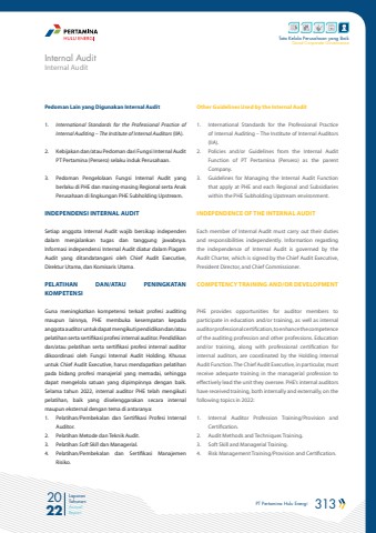 PT Pertamina Hulu Energi 313 2022Laporan TahunanAnnual ReportTata Kelola Perusahaan yang BaikGood Corporate GovernanceOther Guidelines Used by the Internal Audit1. International Standards for the Professional Practice of Internal Auditing %u2013 The Institute of Internal Auditors (IIA).2. Policies and/or Guidelines from the Internal Audit Function of PT Pertamina (Persero) as the parent Company.3. Guidelines for Managing the Internal Audit Function that apply at PHE and each Regional and Subsidiaries within the PHE Subholding Upstream environment.INDEPENDENCE OF THE INTERNAL AUDITEach member of Internal Audit must carry out their duties and responsibilities independently. Information regarding the independence of Internal Audit is governed by the Audit Charter, which is signed by the Chief Audit Executive, President Director, and Chief Commissioner.COMPETENCY TRAINING AND/OR DEVELOPMENTPHE provides opportunities for auditor members to participate in education and/or training, as well as internal auditor professional certification, to enhance the competence of the auditing profession and other professions. Education and/or training, along with professional certification for internal auditors, are coordinated by the Holding Internal Audit Function. The Chief Audit Executive, in particular, must receive adequate training in the managerial profession to effectively lead the unit they oversee. PHE%u2019s internal auditors have received training, both internally and externally, on the following topics in 2022:1. Internal Auditor Profession Training/Provision and Certification.2. Audit Methods and Techniques Training.3. Soft Skill and Managerial Training.4. Risk Management Training/Provision and Certification.Pedoman Lain yang Digunakan Internal Audit1. International Standards for the Professional Practice of Internal Auditing %u2013 The Institute of Internal Auditors (IIA). 2. Kebijakan dan/atau Pedoman dari Fungsi Internal Audit PT Pertamina (Persero) selaku induk Perusahaan.3. Pedoman Pengelolaan Fungsi Internal Audit yang berlaku di PHE dan masing-masing Regional serta Anak Perusahaan di lingkungan PHE Subholding Upstream.INDEPENDENSI INTERNAL AUDITSetiap anggota Internal Audit wajib bersikap independen dalam menjalankan tugas dan tanggung jawabnya. Informasi independensi Internal Audit diatur dalam Piagam Audit yang ditandatangani oleh Chief Audit Executive, Direktur Utama, dan Komisaris Utama.PELATIHAN DAN/ATAU PENINGKATAN KOMPETENSI Guna meningkatkan kompetensi terkait profesi auditing maupun lainnya, PHE membuka kesempatan kepada anggota auditor untuk dapat mengikuti pendidikan dan/atau pelatihan serta sertifikasi profesi internal auditor. Pendidikan dan/atau pelatihan serta sertifikasi profesi internal auditor dikoordinasi oleh Fungsi Internal Audit Holding. Khusus untuk Chief Audit Executive, harus mendapatkan pelatihan pada bidang profesi manajerial yang memadai, sehingga dapat mengelola satuan yang dipimpinnya dengan baik. Selama tahun 2022, internal auditor PHE telah mengikuti pelatihan, baik yang diselenggarakan secara internal maupun eksternal dengan tema di antaranya:1. Pelatihan/Pembekalan dan Sertifikasi Profesi Internal Auditor.2. Pelatihan Metode dan Teknik Audit.3. Pelatihan Soft Skill dan Managerial.4. Pelatihan/Pembekalan dan Sertifikasi Manajemen Risiko. Internal AuditInternal Audit