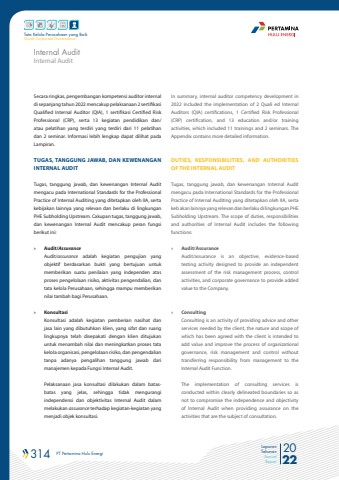314 PT Pertamina Hulu Energi 2022Laporan TahunanAnnual ReportTata Kelola Perusahaan yang BaikGood Corporate GovernanceIn summary, internal auditor competency development in 2022 included the implementation of 2 Quali ed Internal Auditors (QIA) certifications, 1 Certified Risk Professional (CRP) certification, and 13 education and/or training activities, which included 11 trainings and 2 seminars. The Appendix contains more detailed information.DUTIES, RESPONSIBILITIES, AND AUTHORITIES OF THE INTERNAL AUDITTugas, tanggung jawab, dan kewenangan Internal Audit mengacu pada International Standards for the Professional Practice of Internal Auditing yang ditetapkan oleh IIA, serta keb akan lainnya yang relevan dan berlaku di lingkungan PHE Subholding Upstream. The scope of duties, responsibilities and authorities of Internal Audit includes the following functions:%u00bb Audit/AssuranceAudit/assurance is an objective, evidence-basedtesting activity designed to provide an independentassessment of the risk management process, controlactivities, and corporate governance to provide addedvalue to the Company.%u00bb ConsultingConsulting is an activity of providing advice and otherservices needed by the client, the nature and scope ofwhich has been agreed with the client is intended toadd value and improve the process of organizationalgovernance, risk management and control withouttransferring responsibility from management to theInternal Audit Function.The implementation of consulting services is conducted within clearly delineated boundaries so as not to compromise the independence and objectivity of Internal Audit when providing assurance on the activities that are the subject of consultation.Secara ringkas, pengembangan kompetensi auditor internal di sepanjang tahun 2022 mencakup pelaksanaan 2 sertifikasi Qualified Internal Auditor (QIA), 1 sertifikasi Certified Risk Professional (CRP), serta 13 kegiatan pendidikan dan/atau pelatihan yang terdiri yang terdiri dari 11 pelatihan dan 2 seminar. Informasi lebih lengkap dapat dilihat pada Lampiran.TUGAS, TANGGUNG JAWAB, DAN KEWENANGAN INTERNAL AUDIT Tugas, tanggung jawab, dan kewenangan Internal Audit mengacu pada International Standards for the Professional Practice of Internal Auditing yang ditetapkan oleh IIA, serta kebijakan lainnya yang relevan dan berlaku di lingkungan PHE Subholding Upstream. Cakupan tugas, tanggung jawab, dan kewenangan Internal Audit mencakup peran fungsi berikut ini:%u00bb Audit/Assurance Audit/assurance adalah kegiatan pengujian yangobjektif berdasarkan bukti yang bertujuan untukmemberikan suatu penilaian yang independen atasproses pengelolaan risiko, aktivitas pengendalian, dantata kelola Perusahaan, sehingga mampu memberikannilai tambah bagi Perusahaan. %u00bb Konsultasi Konsultasi adalah kegiatan pemberian nasihat danjasa lain yang dibutuhkan klien, yang sifat dan ruanglingkupnya telah disepakati dengan klien ditujukanuntuk menambah nilai dan meningkatkan proses tatakelola organisasi, pengelolaan risiko, dan pengendalian tanpa adanya pengalihan tanggung jawab darimanajemen kepada Fungsi Internal Audit. Pelaksanaan jasa konsultasi dilakukan dalam batasbatas yang jelas, sehingga tidak mengurangi independensi dan objektivitas Internal Audit dalam melakukan assurance terhadap kegiatan-kegiatan yang menjadi objek konsultasi.Internal AuditInternal Audit