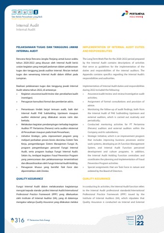 316 PT Pertamina Hulu Energi 2022Laporan TahunanAnnual ReportTata Kelola Perusahaan yang BaikGood Corporate GovernanceIMPLEMENTATION OF INTERNAL AUDIT DUTIES AND RESPONSIBILITIESThe Long Term Work Plan for the 2020-2022 period prepared by the Internal Audit contains descriptions of activities that serve as guidelines for the implementation of the duties and responsibilities of the internal auditors. The Appendix contains specifics regarding the Internal Audit%u2019s responsibilities and authorities.Implementation of Internal Audit duties and responsibilities during 2022 included the following:%u00bb Assurance/audit/review and review/investigative audit activities;%u00bb Assignment of formal consultations and provision of advice.%u00bb Monitoring the follow-up of audit findings, both from the Internal Audit of PHE Subholding Upstream and external auditors, which is carried out routinely and periodically;%u00bb Conducted mentoring activities for PT Pertamina (Persero) auditors and external auditors within the Company and its subsidiaries;%u00bb Strategic Initiative, which is an improvement program that includes improving business processes and/or work systems, developing an IA Function Management System, and Internal Audit Function personnel development and culture programs. In addition, the Internal Audit Holding Function centralizes and coordinates the planning and implementation of Fraud Prevention Program activities.%u00bb Special assignments that are Task Force in nature and ordered by the Board of Directors.QUALITY ASSURANCEIn conducting its activities, the Internal Audit function refers to the Internal Audit professional standards/International Professional Practice Framework (IPPF) issued by the Institute of Internal Auditors (IIA), which stipulates that Quality Assurance is conducted via Internal and External PELAKSANAAN TUGAS DAN TANGGUNG JAWAB INTERNAL AUDIT Rencana Kerja Rencana Jangka Panjang untuk kurun waktu tahun 2020-2022 yang disusun oleh Internal Audit berisi uraian kegiatan yang menjadi pedoman dalam pelaksanaan tugas dan tanggung jawab auditor internal. Rincian terkait tugas dan wewenang Internal Audit dalam dilihat pada Lampiran.Realisasi pelaksanaan tugas dan tanggung jawab Internal Audit selama tahun 2022, di antaranya:%u00bb Kegiatan assurance/audit/review dan penelaahan/audit investigasi;%u00bb Penugasan konsultasi formal dan pemberian advis.%u00bb Pemantauan tindak lanjut temuan audit, baik dari Internal Audit PHE Subholding Upstream maupun auditor eksternal yang dilakukan secara rutin dan berkala;%u00bb Melakukan kegiatan pendampingan terhadap kegiatan Auditor PT Pertamina (Persero) serta auditor eksternal di Perusahaan maupun pada Anak Perusahaan;%u00bb Initiative Strategic, yaitu improvement program yang meliputi perbaikan proses bisnis dan/atau Sistem Tata Kerja, pengembangan Sistem Manajemen Fungsi IA, program pengembangan personel Fungsi Internal Audit, serta program budaya Fungsi Internal Audit. Selain itu, terdapat kegiatan Fraud Prevention Programyang perencanaan dan pelaksanaannya tersentralisasi dan dikoordinasikan oleh Fungsi Internal Audit Holding.%u00bb Penugasan khusus yang bersifat Task Force dan diperintahkan oleh Direksi. QUALITY ASSURANCE Fungsi Internal Audit dalam melaksanakan kegiatannya merujuk kepada standar profesi Internal Audit/International Professional Practice Framework (IPPF) yang dikeluarkan oleh Institute of Internal Auditor (IIA), yang di dalamnya mengatur adanya Quality Assurance yang dilakukan melalui Internal AuditInternal Audit