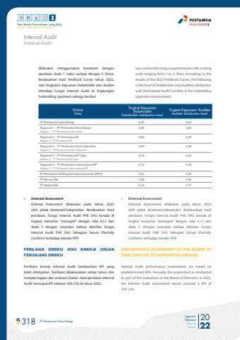 318 PT Pertamina Hulu Energi 2022Laporan TahunanAnnual ReportTata Kelola Perusahaan yang BaikGood Corporate Governancewas conducted using a questionnaire with a rating scale ranging from 1 to 5 (five). According to the results of the 2022 Feedback Survey, the following is the level of Stakeholder and Auditee satisfaction with the Internal Audit Function in the Subholding Upstream environment:%u00bb External AssessmentExternal Assessment dilakukan pada tahun 2022oleh pihak eksternal/independen. Berdasarkan hasilpenilaian, Fungsi Internal Audit PHE SHU berada ditingkat maturitas %u201cmanaged%u201d dengan nilai 4,13 dariskala 5 dengan simpulan bahwa aktivitas FungsiInternal Audit PHE SHU Sebagian Sesuai (PartiallyConform) terhadap standar IPPF.PERFORMANCE ASSESSMENT OF THE BOARD OF DIRECTORS ON ITS SUPPORTING ORGANSInternal Audit performance assessments are based on predetermined KPIs. Annually, the assessment is conducted as part of the evaluation of the Board of Directors. In 2022, the Internal Audit assessment results reached a KPI of 104.12%.dilakukan menggunakan kuesioner dengan penilaian skala 1 (satu) sampai dengan 5 (lima). Berdasarkan hasil Feedback Survey tahun 2022, nilai tingkatan kepuasan Stakeholder dan Auditee terhadap Fungsi Internal Audit di lingkungan Subholding Upstream sebagai berikut:EntitasEntityTingkat Kepuasan StakeholderStakeholder Satisfaction LevelTingkat Kepuasan AuditeeAuditee Satisfaction LevelPT Pertamina Hulu Energi 4,32 4,23Regional 1 %u2013 PT Pertamina Hulu RokanRegion 1 %u2013 PT Pertamina Hulu Rokan4,38 3,82Regional 2 %u2013 PT Pertamina EPRegion 2 %u2013 PT Pertamina EP4,40 4,29Regional 3 %u2013 PT Pertamina Hulu IndonesiaRegion 3 %u2013 PT Pertamina Hulu Indonesia4,49 4,28Regional 4 %u2013 PT Pertamina EP CepuRegion 4 %u2013 PT Pertamina EP Cepu4,33 4,63Regional 5 %u2013 PT Pertamina International EPRegion 5 %u2013 PT Pertamina International EP4,16 4,10PT Pertamina Drilling Services Indonesia (PDSI) 4,45 3,93PT Elnusa Tbk 3,58 3,96PT Badak NGL 4,24 3,77%u00bb External Assessment External Assessment dilakukan pada tahun 2022oleh pihak eksternal/independen. Berdasarkan hasilpenilaian, Fungsi Internal Audit PHE SHU berada ditingkat maturitas %u201cmanaged%u201d dengan nilai 4,13 dariskala 5 dengan simpulan bahwa aktivitas FungsiInternal Audit PHE SHU Sebagian Sesuai (Partially Conform) terhadap standar IPPF.PENILAIAN DIREKSI ATAS KINERJA ORGAN PENUNJANG DIREKSI Penilaian kinerja Internal Audit berdasarkan KPI yang telah ditetapkan. Penilaian dilaksanakan setiap tahun dan menjadi bagian dari evaluasi Direksi. Hasil penilaian Internal Audit mencapai KPI sebesar 104,12% di tahun 2022.Internal AuditInternal Audit
