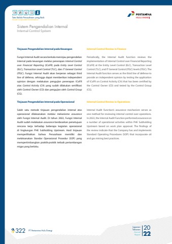 322 PT Pertamina Hulu Energi 2022Laporan TahunanAnnual ReportTata Kelola Perusahaan yang BaikGood Corporate GovernanceTinjauan Pengendalian Internal pada KeuanganFungsi Internal Audit secara berkala meninjau pengendalian Internal pada keuangan melalui penerapan Internal Control over Financial Reporting (ICoFR) pada Entity Level Control(ELC), Transaction Level Control (TLC), dan IT General Control(ITGC). Fungsi Internal Audit akan berperan sebagai third line of defense, sehingga dapat memberikan independent opinion dengan melakukan pengujian penerapan ICoFR atas Control Activity (CA) yang sudah dilakukan sertifikasi oleh Control Owner (CO) dan pengujian oleh Control Group (CG).Tinjauan Pengendalian Internal pada Operasional Salah satu metode tinjauan pengendalian internal atas operasional dilaksanakan melalui mekanisme assurance oleh Fungsi Internal Audit. Di tahun 2022, Fungsi Internal Audit sudah melakukan assurance berdasarkan persetujuan rencana kerja terhadap beberapa kegiatan operasional di lingkungan PHE Subholding Upstream. Hasil tinjauan memperlihatkan bahwa Perusahaan memiliki dan melaksanakan Standar Operasional Prosedur (SOP) yang mempertimbangkan praktik-praktik terbaik pertambangan migas yang berlaku.Internal Control Review in FinancePeriodically, the Internal Audit function reviews the implementation of Internal Control over Financial Reporting (ICoFR) at the Entity Level Control (ELC), Transaction Level Control (TLC), and IT General Control (ITGC) levels (ITGC). The Internal Audit function serves as the third line of defense to provide an independent opinion by testing the application of ICoFR on Control Activity (CA) that has been certified by the Control Owner (CO) and tested by the Control Group (CG).Internal Control Review in OperationsInternal Audit Function%u2019s assurance mechanism serves as one method for reviewing internal control over operations. In 2022, the Internal Audit Function performed assurance on a number of operational activities within PHE Subholding Upstream based on work plan approval. The findings of the review indicate that the Company has and implements Standard Operating Procedures (SOP) that incorporate oil and gas mining best practices.Internal Control SystemSistem Pengendalian Internal