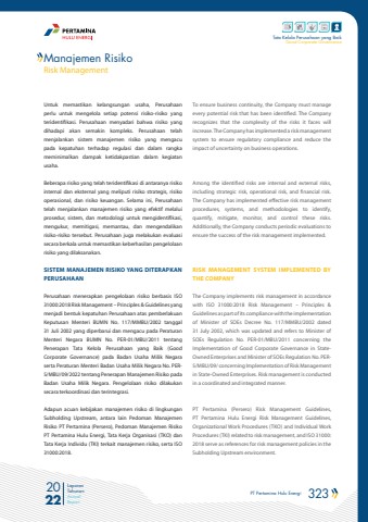 PT Pertamina Hulu Energi 323 2022Laporan TahunanAnnual ReportTata Kelola Perusahaan yang BaikGood Corporate GovernanceUntuk memastikan kelangsungan usaha, Perusahaan perlu untuk mengelola setiap potensi risiko-risiko yang teridentifikasi. Perusahaan menyadari bahwa risiko yang dihadapi akan semakin kompleks. Perusahaan telah menjalankan sistem manajemen risiko yang mengacu pada kepatuhan terhadap regulasi dan dalam rangka meminimalkan dampak ketidakpastian dalam kegiatan usaha. Beberapa risiko yang telah teridentifikasi di antaranya risiko internal dan eksternal yang meliputi risiko strategis, risiko operasional, dan risiko keuangan. Selama ini, Perusahaan telah menjalankan manajemen risiko yang efektif melalui prosedur, sistem, dan metodologi untuk mengidentifikasi, mengukur, memitigasi, memantau, dan mengendalikan risiko-risiko tersebut. Perusahaan juga melakukan evaluasi secara berkala untuk memastikan keberhasilan pengelolaan risiko yang dilaksanakan.SISTEM MANAJEMEN RISIKO YANG DITERAPKAN PERUSAHAAN Perusahaan menerapkan pengelolaan risiko berbasis ISO 31000:2018 Risk Management %u2013 Principles & Guidelines yang menjadi bentuk kepatuhan Perusahaan atas pemberlakuan Keputusan Menteri BUMN No. 117/MMBU/2002 tanggal 31 Juli 2002 yang diperbarui dan mengacu pada Peraturan Menteri Negara BUMN No. PER-01/MBU/2011 tentang Penerapan Tata Kelola Perusahaan yang Baik (Good Corporate Governance) pada Badan Usaha Milik Negara serta Peraturan Menteri Badan Usaha Milik Negara No. PER5/MBU/09/2022 tentang Penerapan Manajemen Risiko pada Badan Usaha Milik Negara. Pengelolaan risiko dilakukan secara terkoordinasi dan terintegrasi.Adapun acuan kebijakan manajemen risiko di lingkungan Subholding Upstream, antara lain Pedoman Manajemen Risiko PT Pertamina (Persero), Pedoman Manajemen Risiko PT Pertamina Hulu Energi, Tata Kerja Organisasi (TKO) dan Tata Kerja Individu (TKI) terkait manajemen risiko, serta ISO 31000:2018.To ensure business continuity, the Company must manage every potential risk that has been identified. The Company recognizes that the complexity of the risks it faces will increase. The Company has implemented a risk management system to ensure regulatory compliance and reduce the impact of uncertainty on business operations.Among the identified risks are internal and external risks, including strategic risk, operational risk, and financial risk. The Company has implemented effective risk management procedures, systems, and methodologies to identify, quantify, mitigate, monitor, and control these risks. Additionally, the Company conducts periodic evaluations to ensure the success of the risk management implemented.RISK MANAGEMENT SYSTEM IMPLEMENTED BY THE COMPANYThe Company implements risk management in accordance with ISO 31000:2018 Risk Management %u2013 Principles & Guidelines as part of its compliance with the implementation of Minister of SOEs Decree No. 117/MMBU/2002 dated 31 July 2002, which was updated and refers to Minister of SOEs Regulation No. PER-01/MBU/2011 concerning the Implementation of Good Corporate Governance in StateOwned Enterprises and Minister of SOEs Regulation No. PER5/MBU/09/ concerning Implementation of Risk Management in State-Owned Enterprises. Risk management is conducted in a coordinated and integrated manner.PT Pertamina (Persero) Risk Management Guidelines, PT Pertamina Hulu Energi Risk Management Guidelines, Organizational Work Procedures (TKO) and Individual Work Procedures (TKI) related to risk management, and ISO 31000: 2018 serve as references for risk management policies in the Subholding Upstream environment.Manajemen RisikoRisk Management
