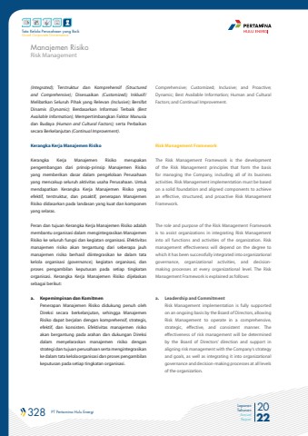 328 PT Pertamina Hulu Energi 2022Laporan TahunanAnnual ReportTata Kelola Perusahaan yang BaikGood Corporate Governance(Integrated); Terstruktur dan Komprehensif (Structured and Comprehensive); Disesuaikan (Customized); Inklusif/Melibatkan Seluruh Pihak yang Relevan (Inclusive); Bersifat Dinamis (Dynamic); Berdasarkan Informasi Terbaik (Best Available Information); Mempertimbangkan Faktor Manusia dan Budaya (Human and Cultural Factors); serta Perbaikan secara Berkelanjutan (Continual Improvement).Kerangka Kerja Manajemen RisikoKerangka Kerja Manajemen Risiko merupakan pengembangan dari prinsip-prinsip Manajemen Risiko yang memberikan dasar dalam pengelolaan Perusahaan yang mencakup seluruh aktivitas usaha Perusahaan. Untuk mendapatkan Kerangka Kerja Manajemen Risiko yang efektif, terstruktur, dan proaktif, penerapan Manajemen Risiko didasarkan pada landasan yang kuat dan komponen yang selaras.Peran dan tujuan Kerangka Kerja Manajemen Risiko adalah membantu organisasi dalam mengintegrasikan Manajemen Risiko ke seluruh fungsi dan kegiatan organisasi. Efektivitas manajemen risiko akan tergantung dari seberapa jauh manajemen risiko berhasil diintegrasikan ke dalam tata kelola organisasi (governance), kegiatan organisasi, dan proses pengambilan keputusan pada setiap tingkatan organisasi. Kerangka Kerja Manajemen Risiko dijelaskan sebagai berikut:a. Kepemimpinan dan KomitmenPenerapan Manajemen Risiko didukung penuh oleh Direksi secara berkelanjutan, sehingga Manajemen Risiko dapat berjalan dengan komprehensif, strategis, efektif, dan konsisten. Efektivitas manajemen risiko akan bergantung pada arahan dan dukungan Direksi dalam menyelaraskan manajemen risiko dengan strategi dan tujuan perusahaan serta mengintegrasikan ke dalam tata kelola organisasi dan proses pengambilan keputusan pada setiap tingkatan organisasi.Comprehensive; Customized; Inclusive; and Proactive; Dynamic; Best Available Information; Human and Cultural Factors; and Continual Improvement.Risk Management FrameworkThe Risk Management Framework is the development of the Risk Management principles that form the basis for managing the Company, including all of its business activities. Risk Management implementation must be based on a solid foundation and aligned components to achieve an effective, structured, and proactive Risk Management Framework.The role and purpose of the Risk Management Framework is to assist organizations in integrating Risk Management into all functions and activities of the organization. Risk management effectiveness will depend on the degree to which it has been successfully integrated into organizational governance, organizational activities, and decisionmaking processes at every organizational level. The Risk Management Framework is explained as follows:a. Leadership and CommitmentRisk Management implementation is fully supported on an ongoing basis by the Board of Directors, allowing Risk Management to operate in a comprehensive, strategic, effective, and consistent manner. The effectiveness of risk management will be determined by the Board of Directors%u2019 direction and support in aligning risk management with the Company%u2019s strategy and goals, as well as integrating it into organizational governance and decision-making processes at all levels of the organization.Risk ManagementManajemen Risiko
