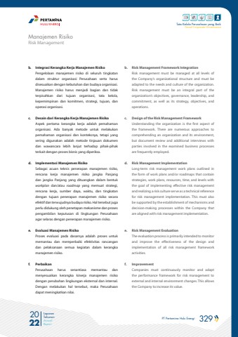 PT Pertamina Hulu Energi 329 2022Laporan TahunanAnnual ReportTata Kelola Perusahaan yang BaikGood Corporate Governanceb. Integrasi Kerangka Kerja Manajemen RisikoPengelolaan manajemen risiko di seluruh tingkatan dalam struktur organisasi Perusahaan serta harus disesuaikan dengan kebutuhan dan budaya organisasi. Manajemen risiko harus menjadi bagian dan tidak terpisahkan dari tujuan organisasi, tata kelola, kepemimpinan dan komitmen, strategi, tujuan, dan operasi organisasi.c. Desain dari Kerangka Kerja Manajemen RisikoAspek pertama kerangka kerja adalah pemahaman organisasi. Ada banyak metode untuk melakukan pemahaman organisasi dan konteksnya, tetapi yang sering digunakan adalah metode tinjauan dokumen dan wawancara lebih lanjut terhadap pihak-pihak terkait dengan proses bisnis yang diperiksa.d. Implementasi Manajemen RisikoSebagai acuan teknis penerapan manajemen risiko, rencana kerja manajemen risiko jangka Panjang dan jangka Panjang yang dituangkan dalam bentuk workplan dan/atau roadmap yang memuat strategi, rencana kerja, sumber daya, waktu, dan tingkatan dengan tujuan penerapan manajemen risiko secara efektif dan terwujudnya budaya risiko. Hal tersebut juga perlu didukung oleh penetapan mekanisme dan proses pengambilan keputusan di lingkungan Perusahaan agar selaras dengan penerapan manajemen risiko.e. Evaluasi Manajemen RisikoProses evaluasi pada dasarnya adalah proses untuk memantau dan memperbaiki efektivitas rancangan dan pelaksanaan semua kegiatan dalam kerangka manajemen risiko.f. PerbaikanPerusahaan harus senantiasa memantau dan menyesuaikan kerangka kinerja manajemen risiko dengan perubahan lingkungan eksternal dan internal. Dengan melakukan hal tersebut, maka Perusahaan dapat meningkatkan nilai.b. Risk Management Framework IntegrationRisk management must be managed at all levels of the Company%u2019s organizational structure and must be adapted to the needs and culture of the organization. Risk management must be an integral part of the organization%u2019s objectives, governance, leadership, and commitment, as well as its strategy, objectives, and operations.c. Design of the Risk Management FrameworkUnderstanding the organization is the first aspect of the framework. There are numerous approaches to comprehending an organization and its environment, but document review and additional interviews with parties involved in the examined business processes are frequently employed.d. Risk Management ImplementationLong-term risk management work plans outlined in the form of work plans and/or roadmaps that contain strategies, work plans, resources, time, and levels with the goal of implementing effective risk management and realizing a risk culture serve as a technical reference for risk management implementation. This must also be supported by the establishment of mechanisms and decision-making processes within the Company that are aligned with risk management implementation.e. Risk Management EvaluationThe evaluation process is primarily intended to monitor and improve the effectiveness of the design and implementation of all risk management framework activities.f. ImprovementCompanies must continuously monitor and adapt the performance framework for risk management to external and internal environment changes. This allows the Company to increase its value.Risk ManagementManajemen Risiko