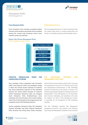 330 PT Pertamina Hulu Energi 2022Laporan TahunanAnnual ReportTata Kelola Perusahaan yang BaikGood Corporate GovernanceRisk Management ProcessThe risk management process is a series of systematic steps that enable target owners to manage opportunities and threats in a controlled, systematic, and measurable manner.PHE SUBHOLDING UPSTREAM RISK MANAGEMENT STRUCTUREBoard of Directors Decree dated 31 March 2021 concerning the Organizational Structure of PT Pertamina Hulu Energi. And Organizational Implementation at PHE Subholding Upstream and Directions of the Director of Finance of PT Pertamina regarding the Delegation of Authority, Duties and Responsibilities of Risk Management for the Directorate/Neck Function, Subholding, and Subsidiaries (AP) under the Holding. The Policy & Risk Management function is responsible for risk management at PHE Subholding Upstream.The PHE Subholding Upstream Risk Management management structure is also outlined in the Pertamina Hulu Energi Risk Management Guidelines, which state that Proses Manajemen RisikoProses manajemen risiko merupakan serangkaian langkah sistematis untuk membantu para pemilik sasaran mengelola peluang dan ancaman bagi tercapainya sasaran secara sistematis, terukur, dan terkendali. Communication & ConsultationRecording & ReportingMonitoring & ReviewScope, Context, CriteriaRisk TreatmentRisk AssessmentRisk IdentificationRisk AnalysisRisk EvaluationDesain Alur/Proses Manajemen RisikoRisk Management Design ProcessSTRUKTUR PENGELOLAAN RISIKO PHE SUBHOLDING UPSTREAMDasar penetapan struktur pengelolaan risiko Perusahaan adalah Surat Keputusan Direksi yang ditetapkan tanggal 31 Maret 2021 tentang Struktur Organisasi PT Pertamina Hulu Energi Implementasi Organisasi di PHE Subholding Upstream dan Arahan Direktur Keuangan PT Pertamina perihal Penyampaian Wewenang, Tugas, dan Tanggung Jawab Manajemen Risiko Direktorat/Fungsi Leher, Subholding, dan Anak Perusahaan (AP) di bawah Holding. Fungsi Policy & Risk Management bertanggung jawab atas pengelolaan risiko di PHE Subholding Upstream. Struktur pengelolaan Manajemen Risiko PHE Subholding Upstream dituangkan juga dalam Pedoman Manajemen Risiko Pertamina Hulu Energi, bahwa Direksi Perusahaan Risk ManagementManajemen Risiko