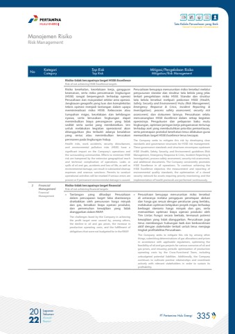 PT Pertamina Hulu Energi 335 2022Laporan TahunanAnnual ReportTata Kelola Perusahaan yang BaikGood Corporate GovernanceNo KategoriCategoryTop RiskTop RiskMitigasi/Pengelolaan RisikoMitigation/Risk ManagementRisiko tidak tercapainya target HSSE ExcellenceRisk of not achieving HSSE Excellence targetsRisiko kesehatan, kecelakaan kerja, gangguan keamanan, serta risiko pencemaran lingkungan (HSSE) sangat berpengaruh terhadap operasi Perusahaan dan masyarakat sekitar area operasi. Jangkauan geografis yang luas dan kompleksitas teknis operasi menjadi tantangan dalam upaya meminimalisasi risiko HSSE. Kebocoran atau tumpahan migas, kecelakaan dan kehilangan nyawa, serta kerusakan lingkungan dapat menimbulkan biaya penanganan yang tidak sedikit serta sanksi yang memberatkan. Izin untuk melakukan kegiatan operasional akan ditangguhkan jika terbukti adanya kesalahan yang serius atau menimbulkan kerusakan permanen pada lingkungan hidup.Health risks, work accidents, security disturbances, and environmental pollution risks (HSSE) have a significant impact on the Company's operations and the surrounding communities. Efforts to minimize HSSE risk are hampered by the extensive geographical reach and technical complication of operations. Leaks or spills of oil and gas, accidents and loss of life, as well as environmental damage, can result in substantial cleanup expenses and onerous sanctions. Permits to conduct operational activities will be revoked if serious errors are proven or if permanent environmental damage is caused.Perusahaan berupaya menurunkan risiko tersebut melalui penyusunan standar dan struktur tata kelola yang jelas terkait pengelolaan risiko HSSE. Standar dan struktur tata kelola tersebut meliputi pedoman HSSE (Health, Safety, Security and Environment) Hulu (Risk Management, Emergency Response & Crisis, Incident Reporting & Investigation), process safety assessment, security risk assessment, dan dokumen lainnya. Perusahaan selalu mencanangkan HSSE Excellence dalam setiap kegiatan operasinya. Pengukuran dan pelaporan baku mutu lingkungan, optimasi jaringan kerja pengamanan tertutup terhadap aset yang membutuhkan prioritas pemantauan, serta penerapan protokol kesehatan terus dilakukan guna memastikan target HSSE Excellence terus tercapai.The Company seeks to mitigate this risk by developing clear standards and governance structures for HSSE risk management.These governance standards and structures encompass upstream HSSE (Health, Safety, Security, and Environment) guidelines (Risk Management, Emergency Response & Crisis, Incident Reporting & Investigation), process safety assessment, security risk assessment, and additional documents. The Company consistently promotes HSSE Excellence in all operations. To continue achieving the HSSE Excellence objective, the measurement and reporting of environmental quality standards, the optimization of a closed security network for assets requiring priority monitoring, and the implementation of health protocols are performed continuously.2 Financial ManagementFinancial ManagementRisiko tidak tercapainya target finansialRisk of not achieving financial targets%u00bb Tantangan yang dihadapi Perusahaan dalam pencapaian target laba diantaranya disebabkan oleh penurunan harga minyak dan gas, kenaikan biaya operasi produksi, dan pemenuhan kewajiban yang tidak dianggarkan dalam RKAP.The challenges faced by the Company in achieving the profit target were caused by, among others, the decline in oil and gas prices, the increase in production operating costs, and the fulfillment of obligations that were not budgeted for in the RKAP.%u00bb Perusahaan berupaya menurunkan risiko tersebut di antaranya melalui pengajuan penetapan alokasi dan harga gas sesuai dengan peraturan yang berlaku, melakukan optimasi kelayakan proyek migas terhadap berbagai skenario harga minyak dan gas, serta memastikan optimasi biaya operasi produksi oleh Tim Lintas Fungsi secara berkala, termasuk potensi kewajiban yang tidak dianggarkan. Perusahaan juga terus membangun hubungan baik dan berkoordinasi aktif dengan stakeholder terkait untuk terus menjaga tingkat profitabilitas Perusahaan.The Company seeks to mitigate this risk by, among other things, submitting determinations of gas allocations and prices in accordance with applicable regulations, optimizing the feasibility of oil and gas projects for various scenarios of oil and gas prices, and ensuring periodic optimization of production operating costs by the Cross-Functional Team, including unbudgeted potential liabilities. Additionally, the Company continues to cultivate positive relationships and coordinate actively with relevant stakeholders in order to sustain its profitability.Risk ManagementManajemen Risiko