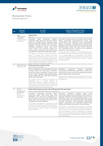PT Pertamina Hulu Energi 337 2022Laporan TahunanAnnual ReportTata Kelola Perusahaan yang BaikGood Corporate GovernanceNo KategoriCategoryTop RiskTop RiskMitigasi/Pengelolaan RisikoMitigation/Risk Management4 Legal, Governance, & ComplianceLegal, Governance, & ComplianceRisiko hukumLegal riskPerusahaan dalam menjalankan kegiatan operasional tidak lepas dari bermitra dengan pihak lain. Terdapat potensi interpretasi yang berbeda antara para pihak atas ketentuan dalam perjanjian dan/atau hukum dan perundangundangan, perselisihan hukum, atau proses hukum lainnya. Proses tersebut, terlepas dari hasilnya, dapat menimbulkan biaya tidak terduga dan publisitas negatif bagi reputasi Perusahaan.The Company, in carrying out operational activities, cannot be separated from partnering with other parties. Different interpretations of the provisions of the agreement and/or laws and regulations, legal disputes, or other legal processes are possible. Regardless of the outcome, the process may result in unexpected costs and negative publicity for the Company's reputation.Perusahaan berupaya untuk menurunkan risiko tersebut melalui penyusunan klausula-klausula hukum yang mencerminkan hasil pembahasan yang komprehensif dengan counterparts, sehingga dapat meminimalisasi perbedaan interpretasi, berkoordinasi aktif dengan pihak lembaga hukum terkait dan kuasa hukum eksternal, serta stakeholder lainnya. Perusahaan terus melakukan pengelolaan risiko legal yang timbul.The Company seeks to mitigate this risk by drafting legal clauses that reflect the results of in-depth discussions with counterparts, so as to minimize differences in interpretation, and by actively coordinating with the relevant legal institutions, external attorneys, and other stakeholders. The Company continues to manage emerging legal risks.5 Corporate ImageCorporate ImageRisiko penurunan corporate imageRisk of corporate image declineDalam menjalankan bisnis, Perusahaan berusaha menjaga reputasi dan kepercayaan stakeholderantara lain dengan menjalankan standar operasi industri migas, menjaga hubungan/komunikasi dengan stakeholder dan media, serta mengelola pemberitaan Perusahaan.The Company strives to maintain its reputation and stakeholders' trust in its business operations by implementing standard operating procedures for the oil and gas industry, maintaining relationships/communication with stakeholders and the media, and managing Company news, among other means.Melakukan engagement dengan stakeholder, menyampaikan pemberitaan positif, baik di media massa cetak maupun media online, serta memberikan konfirmasi/laporan apabila ada isu yang beredar.Engaging with stakeholders, disseminating positive news in print and online media, and providing confirmation/reports if there are circulating issues.6 Business Environment & OperationalBusiness Environment & OperationalRisiko tidak tercapainya target volume lifting minyak dan gas (migas) Risk of not achieving the target volume of oil and gas liftingPerusahaan menghadapi tantangan dalam pemenuhan target volume lifting migas yang disebabkan oleh penurunan penyerapan gas dari konsumen, menurunnya kehandalan fasilitas lifting migas dan transportasi ke pembeli, serta terganggunya jadwal pengapalan.The Company faces difficulties in achieving its oil and gas lifting volume target due to reduced gas absorption by consumers, decreased reliability of oil and gas lifting and transportation facilities to buyers, and disrupted shipping schedules.Perusahaan melakukan berbagai upaya untuk menurunkan dampak dan kemungkinan risiko tersebut, di antaranya melakukan koordinasi dengan konsumen dan stakeholder terkait guna mengoptimalkan lifting migas, serta mengusulkan opsi ekspor jika tidak dapat diserap domestik. Perusahaan juga memastikan pelaksanaan program maintenance dan kehandalan fasilitas lifting berjalan sesuai kaidah best practices di Industri Migas.The Company is coordinating with consumers and relevant stakeholders to optimize oil and gas lifting and proposing export options if they cannot be absorbed domestically to mitigate the impact and likelihood of these risks. Additionally, the Company ensures that the implementation of the maintenance program and the dependability of the lifting facilities adhere to Oil and Gas Industry best practices.Risk ManagementManajemen Risiko
