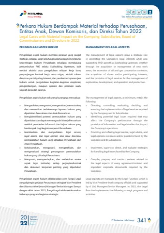 PT Pertamina Hulu Energi 341 2022Laporan TahunanAnnual ReportTata Kelola Perusahaan yang BaikGood Corporate GovernancePENGELOLAAN ASPEK HUKUMPengelolaan aspek hukum memiliki peranan yang sangat strategis, sebagai salah satu fungsi utama dalam melindungi kepentingan hukum Perusahaan sekaligus mendukung pertumbuhan PHE selaku Subholding Upstream, baik melalui akuisisi atau pengelolaan wilayah kerja baru, perpanjangan kontrak kerja sama migas, akuisisi saham dan/atau participating interest, dan pemberian layanan jasa hukum untuk pengelolaan kegiatan-kegiatan eksplorasi, pengembangan, maupun operasi dan produksi suatu wilayah kerja dan lainnya. Pengelolaan aspek hukum sekurang-kurangnya mencakup:%u00bb Mengarahkan, mengontrol, mengevaluasi, memutuskan, dan memastikan terlaksananya layanan hukum yang diperlukan Perusahaan dan Anak Perusahaan.%u00bb Mengidentifikasi potensi permasalahan hukum yang diperlukan dan dapat memengaruhi kinerja Perusahaan melalui pemberian informasi dan kajian hukum yang berdampak bagi kegiatan operasi Perusahaan.%u00bb Memberikan dan menyediakan legal service, legal advice, dan legal opinion atas issue dan/atau permasalahan hukum yang dihadapi Perusahaan dan Anak Perusahaan.%u00bb Melaksanakan, mengawasi, mengarahkan, dan mengevaluasi strategi penanganan permasalahan hukum yang dihadapi Perusahaan.%u00bb Menyusun, mempersiapkan, dan melakukan review aspek legal terhadap setiap perjanjian/kontrak dan dokumen korporasi penting yang diperlukan Perusahaan.Pengelolaan aspek hukum dilaksanakan oleh Fungsi Legal yang dipimpin pejabat Perusahaan setingkat Vice President dan dibantu oleh 6 (enam) Manager/Senior Manager. Sampai dengan akhir tahun 2022, Fungsi Legal telah melaksanakan beberapa program/kegiatan strategis: MANAGEMENT OF LEGAL ASPECTSThe management of legal aspects plays a strategic role in protecting the Company%u2019s legal interests while also supporting PHE%u2019s growth as Subholding Upstream, whether through the acquisition or management of new work areas; the extension of oil and gas cooperation contracts; the acquisition of shares and/or participating interests; and the provision of legal services for the management of exploration, development, and operation and production.The management of legal aspects, at minimum, entails the following:%u00bb Directing, controlling, evaluating, deciding, and ensuring the implementation of legal services required by the Company and its Subsidiaries.%u00bb Identifying potential legal issues required that may affect the Company%u2019s performance through the provision of information and legal studies that impact the Company%u2019s operations.%u00bb Providing and offering legal service, legal advice, and legal opinions on issues and/or problems faced by the Company and its Subsidiaries.%u00bb Implement, supervise, direct, and evaluate strategies for handling legal issues faced by the Company.%u00bb Compile, prepare, and conduct reviews related to the legal aspects of every agreement/contract and important corporate documents required by the Company.Legal aspects are managed by the Legal Function, which is led by Vice President-level company officials and supported by 6 (six) Managers/Senior Managers. In 2022, the Legal Function implemented the following strategic programs and activities:Legal Cases with Material Impact on the Company, Subsidiaries, Board of Commissioners and Directors in 2022Perkara Hukum Berdampak Material terhadap Perusahaan, Entitas Anak, Dewan Komisaris, dan Direksi Tahun 2022