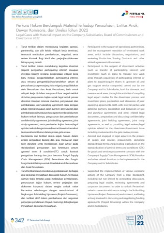 342 PT Pertamina Hulu Energi 2022Laporan TahunanAnnual ReportTata Kelola Perusahaan yang BaikGood Corporate GovernancePerkara Hukum Berdampak Material terhadap Perusahaan, Entitas Anak, Dewan Komisaris, dan Direksi Tahun 2022Legal Cases with Material Impact on the Company, Subsidiaries, Board of Commissioners and Directors in 2022%u00bb Turut terlibat dalam mendukung kegiatan operasi, partnership, dan alih kelola wilayah kerja terminasi, termasuk melakukan pembahasan, negosiasi, serta review Kontrak Bagi Hasil dan perjanjian/dokumen lainnya yang terkait. %u00bb Turut terlibat dalam mendukung kegiatan divestasi (seperti pengalihan participating interest) maupun investasi (seperti rencana pengelolaan wilayah kerja baru melalui pengambilalihan participating interest, atau rencana pengambilalihan/perolehan saham di perusahaan jasa penunjang hulu migas) yang dilakukan oleh Perusahaan dan Anak Perusahaan, baik untuk wilayah kerja di dalam maupun di luar negeri melalui aktivitas penyusunan kajian aspek legal untuk proses divestasi maupun rencana investasi, penyusunan dan pembahasan joint operating agreement, baik dengan pihak internal maupun calon partner, penyusunan dan pembahasan sale and purchase agreement dan dokumen hukum terkait lainnya, penyusunan dan pembahasan confidentiality agreement, joint bidding agreement, joint study agreement, serta pemberian kajian hukum/legal opinion terkait dengan issue divestasi/investasi tersebut termasuk keterlibatan dalam proses gate review.%u00bb Membantu dan terlibat dalam aspek hukum dalam proses pengadaan barang dan jasa, menyusun legal term standard serta memberikan legal advice pada standardisasi persyaratan dan ketentuan umum (general terms & condition/GTC) untuk kontrak pengadaan barang dan jasa bersama Fungsi Supply Chain Management (SCM) Perusahaan dan fungsifungsi terkait lainnya untuk diberlakukan di Perusahaan dan Anak Perusahaan.%u00bb Turut terlibat dalam mendukung pelaksanaan berbagai aksi korporasi Perusahaan dari aspek hukum, termasuk namun tidak terbatas pada melakukan pembahasan, penyusunan kajian hukum, review perjanjian dan dokumen korporasi dalam rangka unlock value Pertamina sehubungan dengan restrukturisasi di lingkungan Subholding Upstream (Project Paramount), dan terlibat aktif dalam pembahasan dan negosiasi perjanjian pendanaan (Project Financing) di lingkungan Perusahaan dan Anak Perusahaan. %u00bb Participated in the support of operations, partnerships, and the management transition of terminated work areas, which include discussions, negotiations, and reviewing Production Sharing Contracts and other related agreements/documents.%u00bb Participated in the support of divestment activities (such as transfer of participating interest) and investment (such as plans to manage new work areas through acquisition of participating interest, or plans to acquire/acquire shares in upstream oil and gas support service companies) carried out by the Company and its Subsidiaries, both for domestic and overseas work areas, through the activities of compiling legal aspect studies for the divestment process and investment plans, preparation and discussion of joint operating agreements, both with internal parties and potential partners, preparation and discussion of sale and purchase agreements and other related legal documents, preparation and discussing confidentiality agreements, joint bidding agreements, joint study agreements, as well as providing legal reviews/legal opinion related to the divestment/investment issue including involvement in the gate review process.%u00bb Assisted and engaged in legal aspects in the process of goods and services procurement, compiling standard legal terms and providing legal advice on the standardization of general terms and conditions (GTC) for goods and services procurement contracts with the Company%u2019s Supply Chain Management (SCM) Function and other related functions to be implemented in the Company and its Subsidiaries.%u00bb Supported the implementation of various corporate actions of the Company from a legal standpoint, including but not limited to conducting discussions, preparing legal studies, reviewing agreements and corporate documents in order to unlock Pertamina%u2019s value in connection with restructuring in the Subholding Upstream (Project Paramount) environment, and being actively involved in discussing and negotiating funding agreements (Project Financing) within the Company and its Subsidiaries.