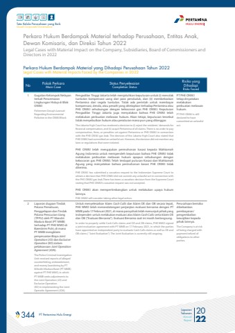344 PT Pertamina Hulu Energi 2022Laporan TahunanAnnual ReportTata Kelola Perusahaan yang BaikGood Corporate GovernanceNo Pokok PerkaraMain CaseStatus PenyelesaianCompletion StatusRisiko yang DihadapiRisks Faced1 Gugatan Kelompok Nelayan terkait Pencemaran Lingkungan Hidup di Blok ONWJFishermen Group%u2019s Lawsuit Regarding Environmental Pollution in the ONWJ BlockPengadilan Tinggi Jakarta telah menjatuhkan keputusan untuk (i) menolak tuntutan kompensasi uang dari para penduduk, dan (ii) membebaskan Pertamina dari segala tuntutan. Tidak ada perintah untuk membayar kompensasi, denda, atau penalti yang ditetapkan terhadap Pertamina atau PHE ONWJ sehubungan dengan kebocoran gas PHE ONWJ. Keputusan Pengadilan Tinggi Jakarta juga menyatakan bahwa PHE ONWJ telah melakukan perbuatan melawan hukum. Akan tetapi, keputusan tersebut tidak menyebutkan hukum atau peraturan mana pun yang dilanggar. The Jakarta High Court has rendered a decision to (i) reject the residents' demands for financial compensation, and (ii) acquit Pertamina of all claims. There is no order to pay compensation, fines, or penalties set against Pertamina or PHE ONWJ in connection with the PHE ONWJ gas leak. The decision of the Jakarta High Court also stated that PHE ONWJ had committed an unlawful act. However, the decision did not mention any laws or regulations that were violated.PHE ONWJ telah mengajukan permohonan kasasi kepada Mahkamah Agung Indonesia untuk memperoleh keputusan bahwa PHE ONWJ tidak melakukan perbuatan melawan hukum apapun sehubungan dengan kebocoran gas PHE ONWJ. Telah terdapat putusan Kasasi dari Mahkamah Agung yang menyatakan bahwa permohonan kasasi PHE ONWJ tidak diterima. PHE ONWJ has submitted a cassation request to the Indonesian Supreme Court to obtain a decision that PHE ONWJ did not commit any unlawful act in connection with the PHE ONWJ gas leak.There has been a cassation decision from the Supreme Court stating that PHE ONWJ's cassation request was not accepted. PHE ONWJ akan mempertimbangkan untuk melakukan upaya hukum lainnya.PHE ONWJ will consider taking other legal action.PT PHE ONWJ tetap dinyatakan melakukan perbuatan melawan hukum.PT PHE ONWJ is still declared to have committed an unlawful act.2 Laporan dugaan Tindak Pidana Pemalsuan, Penggelapan dan Tindak Pidana Pencucian Uang (TPPU) oleh PT Mandiri Madura Barat (PT MMB) terhadap PT PHE WMO di Bareskrim Polri, di mana PT MMB mengklaim penyesuaian Biaya Joint Operation (JO) dan Exclusive Operation (EO) dalam pelaksanaan Joint Operation Agreement (JOA).The Police Criminal Investigation Unit received reports of alleged counterfeiting, embezzlement, and money laundering by PT MAndiri Madura Barat (PT MMB) against PT PHE WMO, in which PT MMB seeks adjustments to the Joint Operation (JO) and Exclusive Operation(EO) in implementing the Joint Operatio Agreement (JOA).Untuk menyelesaikan klaim Cash Calls dan klaim OE dan OB secara tepat, PHE WMO telah menandatangani perjanjian evaluasi bersama dengan PT MMB pada 17 Februari 2021, di mana para pihak telah menunjuk pihak yang independen untuk melakukan evaluasi atas klaim Cash Calls serta klaim OE dan OB (\In order to properly settle Cash Calls claims and OE and OB claims, PHE WMO signed a joint evaluation agreement with PT MMB on 17 February 2021, in which the parties have appointed an independent party to evaluate Cash Calls claims as well as OE and OB claims ( \Perusahaan berisiko dibebankan pembayaran/pengembalian kewajiban kepada pihak lainnya.The Company is at risk of being charged with payment/refund of obligations to other parties.Perkara Hukum Berdampak Material yang Dihadapi Perusahaan Tahun 2022Legal Cases with Material Impacts Faced by the Companies in 2022Perkara Hukum Berdampak Material terhadap Perusahaan, Entitas Anak, Dewan Komisaris, dan Direksi Tahun 2022Legal Cases with Material Impact on the Company, Subsidiaries, Board of Commissioners and Directors in 2022
