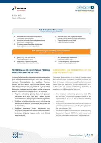 PT Pertamina Hulu Energi 347 2022Laporan TahunanAnnual ReportTata Kelola Perusahaan yang BaikGood Corporate GovernancePENYEBARLUASAN DAN SOSIALISASI PEDOMAN PERILAKU DAN ETIKA BISNIS (COC)Pedoman Perilaku dan Etika Bisnis senantiasa disosialisasikan guna meningkatkan kesadaran para insan PHE Subholding Upstream. Penyebarluasan dan sosialisasi Pedoman Perilaku dan Etika Bisnis juga diberikan kepada pihakpihak berkepentingan lain yang berada di lingkungan PHE Subholding Upstream dan/atau sedang terlihat kerja sama. Realisasi sosialisasi sepanjang tahun 2022, di antaranya:%u00bb Program onboarding pekerja baru, baik program rekrutmen BPS, BPA, dan BKJT terkait dengan implementasi GCG di lingkungan Subholding Upstream;%u00bb Sosialisasi terkait komitmen dan proses GCG, langsung kepada pihak eksternal, diantaranya Vendor Day dan Customers%u2019 Day.%u00bb Sosialisasi penerapan Sistem Manajemen Anti Penyuapan (SMAP) kepada internal stakeholders melalui pertemuan langsung maupun online serta kepada pihak eksternal.DISSEMINATION AND SOCIALIZATION OF THE CODE OF CONDUCT (COC)Continuous dissemination of the Code of Conduct raises the awareness of PHE Subholding Upstream personnel. The Code of Conduct is also disseminated to other interested parties in the PHE Subholding Upstream environment and/or those who are currently collaborating. Realization of socialization in 2022 include the following:%u00bb New employee onboarding programs, both BPS, BPA and BKJT recruitment programs related to the implementation of GCG in the Upstream Subholding environment;%u00bb Direct socialization with external parties regarding GCG commitments and processes, including through Vendor Day and Customers%u2019 Day.%u00bb Socialization of the implementation of the Anti-Bribery Management System (SMAP) to both internal and external stakeholders via direct and online meetings.Bab 4 Komitmen PerusahaanChapter 4 Company's CommitmentBab 5 Perlindungan terhadap Aset PerusahaanChapter 5 Protection of Company AssetsA. Komitmen terhadap Pemegang SahamCommitment to ShareholdersB. Komitmen terhadap Pemangku KepentinganCommitment to StakeholdersC. Tanggung Jawab Sosial dan LingkunganSocial and Environmental ResponsibilityA. Melindungi Aset PerusahaanProtecting Company%u2019s AssetsB. Kerahasiaan Data dan InformasiConfidentiality of Data and InformationD. Aktivitas Politik dan Organisasi ProfesiPolitical Activities and Professional OrganizationsE. Keterbukaan Informasi PublikPublic Information DisclosureC. Hak atas Kekayaan IntelektualIntellectual Property RightsD. Saluran Pelaporan PenyimpanganIrregularities Reporting ChannelCode of ConductKode Etik