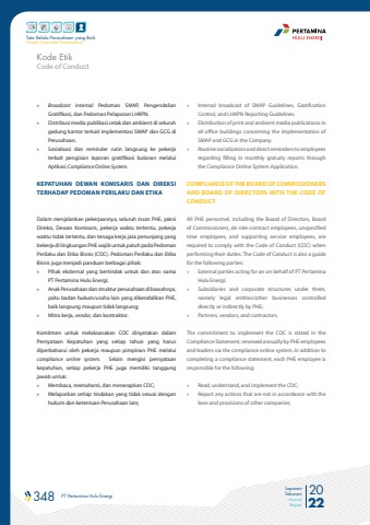 348 PT Pertamina Hulu Energi 2022Laporan TahunanAnnual ReportTata Kelola Perusahaan yang BaikGood Corporate Governance%u00bb Broadcast internal Pedoman SMAP, Pengendalian Gratifikasi, dan Pedoman Pelaporan LHKPN.%u00bb Distribusi media publikasi cetak dan ambient di seluruh gedung kantor terkait implementasi SMAP dan GCG di Perusahaan.%u00bb Sosialisasi dan reminder rutin langsung ke pekerja terkait pengisian laporan gratifikasi bulanan melalui Aplikasi Compliance Online System.KEPATUHAN DEWAN KOMISARIS DAN DIREKSI TERHADAP PEDOMAN PERILAKU DAN ETIKADalam menjalankan pekerjaannya, seluruh insan PHE, yakni Direksi, Dewan Komisaris, pekerja waktu tertentu, pekerja waktu tidak tertentu, dan tenaga kerja jasa penunjang yang bekerja di lingkungan PHE wajib untuk patuh pada Pedoman Perilaku dan Etika Bisnis (COC). Pedoman Perilaku dan Etika Bisnis juga menjadi panduan berbagai pihak:%u00bb Pihak eksternal yang bertindak untuk dan atas nama PT Pertamina Hulu Energi;%u00bb Anak Perusahaan dan struktur perusahaan di bawahnya, yaitu badan hukum/usaha lain yang dikendalikan PHE, baik langsung maupun tidak langsung;%u00bb Mitra kerja, vendor, dan kontraktor.Komitmen untuk melaksanakan COC dinyatakan dalam Pernyataan Kepatuhan yang setiap tahun yang harus diperbaharui oleh pekerja maupun pimpinan PHE melalui compliance online system. Selain mengisi pernyataan kepatuhan, setiap pekerja PHE juga memiliki tanggung jawab untuk:%u00bb Membaca, memahami, dan menerapkan COC;%u00bb Melaporkan setiap tindakan yang tidak sesuai dengan hukum dan ketentuan Perusahaan lain;%u00bb Internal broadcast of SMAP Guidelines, Gratification Control, and LHKPN Reporting Guidelines.%u00bb Distribution of print and ambient media publications in all office buildings concerning the implementation of SMAP and GCG in the Company.%u00bb Routine socialization and direct reminders to employees regarding filling in monthly gratuity reports through the Compliance Online System Application.COMPLIANCE OF THE BOARD OF COMMISSIONERS AND BOARD OF DIRECTORS WITH THE CODE OF CONDUCTAll PHE personnel, including the Board of Directors, Board of Commissioners, de nite-contract employees, unspecified time employees, and supporting service employees, are required to comply with the Code of Conduct (COC) when performing their duties. The Code of Conduct is also a guide for the following parties:%u00bb External parties acting for an on behalf of PT Pertamina Hulu Energi;%u00bb Subsidiaries and corporate structures under them, namely legal entities/other businesses controlled directly or indirectly by PHE;%u00bb Partners, vendors, and contractors.The commitment to implement the COC is stated in the Compliance Statement, renewed annually by PHE employees and leaders via the compliance online system. In addition to completing a compliance statement, each PHE employee is responsible for the following:%u00bb Read, understand, and implement the COC;%u00bb Report any actions that are not in accordance with the laws and provisions of other companies;Code of ConductKode Etik