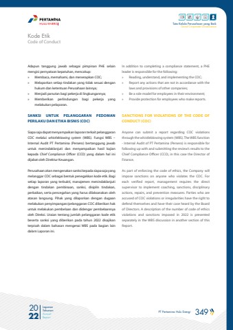 PT Pertamina Hulu Energi 349 2022Laporan TahunanAnnual ReportTata Kelola Perusahaan yang BaikGood Corporate GovernanceAdapun tanggung jawab sebagai pimpinan PHE selain mengisi pernyataan kepatuhan, mencakup:%u00bb Membaca, memahami, dan menerapkan COC;%u00bb Melaporkan setiap tindakan yang tidak sesuai dengan hukum dan ketentuan Perusahaan lainnya;%u00bb Menjadi panutan bagi pekerja di lingkungannya;%u00bb Memberikan perlindungan bagi pekerja yang melakukan pelaporan.SANKSI UNTUK PELANGGARAN PEDOMAN PERILAKU DAN ETIKA BISNIS (COC)Siapa saja dapat menyampaikan laporan terkait pelanggaran COC melalui whistleblowing system (WBS). Fungsi WBS %u2013 Internal Audit PT Pertamina (Persero) bertanggung jawab untuk menindaklanjuti dan menyampaikan hasil kajian kepada Chief Compliance Officer (CCO) yang dalam hal ini dijabat oleh Direktur Keuangan. Perusahaan akan mengenakan sanksi kepada siapa saja yang melanggar COC sebagai bentuk penegakkan kode etik. Bagi setiap laporan yang terbukti, manajemen menindaklanjuti dengan tindakan pembinaan, sanksi, disiplin tindakan, perbaikan, serta pencegahan yang harus dilaksanakan oleh atasan langsung. Pihak yang dilaporkan dengan dugaan melakukan penyimpangan/pelanggaran COC diberikan hak untuk melakukan pembelaan dan didengar pembelaannya oleh Direksi. Uraian tentang jumlah pelanggaran kode etik beserta sanksi yang diberikan pada tahun 2022 disajikan terpisah dalam bahasan mengenai WBS pada bagian lain dalam Laporan ini.In addition to completing a compliance statement, a PHE leader is responsible for the following:%u00bb Reading, understand, and implementing the COC;%u00bb Report any actions that are not in accordance with the laws and provisions of other companies;%u00bb Be a role model for employees in their environment; %u00bb Provide protection for employees who make reports.SANCTIONS FOR VIOLATIONS OF THE CODE OF CONDUCT (COC)Anyone can submit a report regarding COC violations through the whistleblowing system (WBS). The WBS function - Internal Audit of PT Pertamina (Persero) is responsible for following up with and submitting the review%u2019s results to the Chief Compliance Officer (CCO), in this case the Director of Finance.As part of enforcing the code of ethics, the Company will impose sanctions on anyone who violates the COC. For each verified report, management requires the direct supervisor to implement coaching, sanctions, disciplinary actions, repairs, and prevention measures. Parties who are accused of COC violations or irregularities have the right to defend themselves and have their case heard by the Board of Directors. A description of the number of code of ethics violations and sanctions imposed in 2022 is presented separately in the WBS discussion in another section of this Report.Code of ConductKode Etik