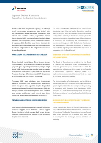 PT Pertamina Hulu Energi 35 2022Laporan TahunanAnnual ReportLaporan ManajemenManagement ReportKomite Audit telah menjalankan tugasnya, di antaranya terkait pemantauan, pengawasan, dan diskusi rutin atas penyelesaian laporan keuangan, pelaksanaan audit internal, dan keandalan sistem pengendalian internal. Komite Investasi telah membantu Dewan Komisaris dalam menelaah dan mengawasi proses pelaksanaan investasi di sepanjang 2022. Demikian pula, Komite Nominasi dan Remunerasi telah menjalankan tugas dan fungsinya dengan baik terkait fungsi nominasi dan fungsi remunerasi sesuai dengan Board Manual.PANDANGAN ATAS PENERAPAN TATA KELOLADewan Komisaris menilai bahwa Direksi bersama dengan organ tata kelola telah penerapan tata kelola perusahaan yang baik (good corporate governance/GCG) dengan sangat baik di 2022. Kami memberikan apresiasi pada pencapaian hasil penilaian penerapan GCG yang dilakukan oleh Badan Pengawas Keuangan & Pembangunan (BPKP) dengan skor 85,052 dari skala 100 atau kategori %u201cSangat Baik%u201d,Penerapan GCG telah didukung oleh implementasi kebijakan antikorupsi dan antipenyuapan. Pelaksanaan sistem manajemen risiko juga telah berjalan dengan baik sesuai dengan kaidah Enterprise Risk Management (ERM) dan merujuk pada ISO 31000-2018 Pengelolaan Risiko. Demikian pula, dengan pelaksanaan audit internal dan sistem pengaduan pelanggaran (whistle-blowing system/WBS).PERUBAHAN KOMPOSISI DEWAN KOMISARISPada periode tahun buku pelaporan, tidak ada perubahan komposisi anggota Dewan Komisaris. Seluruh anggota Dewan Komisaris bekerja dengan baik sesuai dengan perannya dalam memastikan kegiatan usaha Perusahaan berjalan secara maksimal. The Audit Committee has fulfilled its duties, which include monitoring, supervising, and routine discussions regarding the completion of financial statements, conducting internal audits, and the reliability of the internal control system. The Investment Committee assisted the Board of Commissioners in reviewing and supervising the implementation of investments throughout 2022. Similarly, the Nomination and Remuneration Committee has fulfilled its duties and responsibilities regarding nomination and compensation in accordance with the Board Manual.OVERVIEW OF GOOD CORPORATE GOVERNANCE IMPLEMENTATIONThe Board of Commissioners considers that the Board of Directors and governance organs implemented good corporate governance (GCG) exceptionally in 2022. We appreciate the achievement of the results of the Financial & Development Supervisory Agency's (BPKP) GCG implementation assessment with a score of 85.02 on a scale of 100, or the 'Very Good' category. The implementation of anti-corruption and anti-bribery policies have aided GCG implementation. Risk management system implementation has also been proceeding smoothly in accordance with Enterprise Risk Management (ERM) principles, ISO 31000-2018 Risk Management, and through the implementation of internal audits and a whistleblowing system (WBS).CHANGES IN THE COMPOSITION OF THE BOARD OF COMMISSIONERSDuring the reporting period, no changes were made in the composition of the members of the Board of Commissioners. All members of the Board of Commissioners have performed their duties effectively in accordance with their roles in ensuring that the Company's business activities run optimally.Report from the Board of CommissionersLaporan Dewan Komisaris