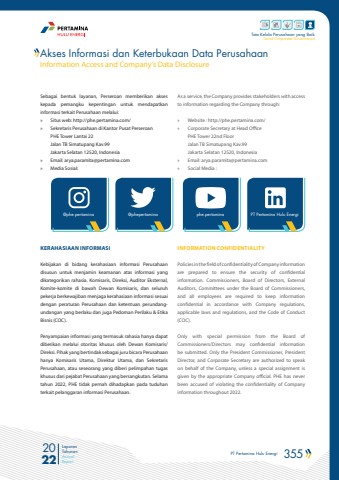 PT Pertamina Hulu Energi 355 2022Laporan TahunanAnnual ReportTata Kelola Perusahaan yang BaikGood Corporate GovernanceSebagai bentuk layanan, Perseroan memberikan akses kepada pemangku kepentingan untuk mendapatkan informasi terkait Perusahaan melalui:%u00bb Situs web: http://phe.pertamina.com/ %u00bb Sekretaris Perusahaan di Kantor Pusat PerseroanPHE Tower Lantai 22Jalan TB Simatupang Kav.99 Jakarta Selatan 12520, Indonesia%u00bb Email: arya.paramita@pertamina.com%u00bb Media Sosial:@phe.pertamina @phepertamina phe.pertamina PT Pertamina Hulu EnergiKERAHASIAAN INFORMASI Kebijakan di bidang kerahasiaan informasi Perusahaan disusun untuk menjamin keamanan atas informasi yang dikategorikan rahasia. Komisaris, Direksi, Auditor Eksternal, Komite-komite di bawah Dewan Komisaris, dan seluruh pekerja berkewajiban menjaga kerahasiaan informasi sesuai dengan peraturan Perusahaan dan ketentuan perundangundangan yang berlaku dan juga Pedoman Perilaku & Etika Bisnis (COC). Penyampaian informasi yang termasuk rahasia hanya dapat diberikan melalui otoritas khusus oleh Dewan Komisaris/Direksi. Pihak yang bertindak sebagai juru bicara Perusahaan hanya Komisaris Utama, Direktur Utama, dan Sekretaris Perusahaan, atau seseorang yang diberi pelimpahan tugas khusus dari pejabat Perusahaan yang bersangkutan. Selama tahun 2022, PHE tidak pernah dihadapkan pada tuduhan terkait pelanggaran informasi Perusahaan. As a service, the Company provides stakeholders with access to information regarding the Company through:%u00bb Website : http://phe.pertamina.com/ %u00bb Corporate Secretary at Head OfficePHE Tower 22nd FloorJalan TB Simatupang Kav.99 Jakarta Selatan 12520, Indonesia%u00bb Email: arya.paramita@pertamina.com%u00bb Social Media :INFORMATION CONFIDENTIALITYPolicies in the field of confidentiality of Company information are prepared to ensure the security of confidential information. Commissioners, Board of Directors, External Auditors, Committees under the Board of Commissioners, and all employees are required to keep information confidential in accordance with Company regulations, applicable laws and regulations, and the Code of Conduct (COC).Only with special permission from the Board of Commissioners/Directors may confidential information be submitted. Only the President Commissioner, President Director, and Corporate Secretary are authorized to speak on behalf of the Company, unless a special assignment is given by the appropriate Company official. PHE has never been accused of violating the confidentiality of Company information throughout 2022.Akses Informasi dan Keterbukaan Data PerusahaanInformation Access and Company%u2019s Data Disclosure