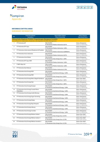 PT Pertamina Hulu Energi 359 2022AppendixLampiranINFORMASI ENTITAS ANAKSUBSIDIARY INFORMATIONNo Anak PerusahaanSubsidiaryKepemilikan SahamShare OwnershipStatus OperasiOperating StatusBidang Usaha: Eksplorasi, Produksi, Pengembangan, Manajemen PortofolioLine of Business: Exploration, Production, Development, Portfolio Management 1 PT Pertamina EP PHE: 99,99%PT Pertamina Pedeve Indonesia: 0,01%Status: BeroperasiStatus: In Operation 2 PT Pertamina EP Cepu PHE: 99,00%PT Pertamina Pedeve Indonesia: 1,00%Status: BeroperasiStatus: In Operation 3 PT Pertamina Internasional Eksplorasi & Produksi PHE: 99,99%PT Pertamina Pedeve Indonesia: 0,000002%Status: BeroperasiStatus: In Operation 4 PT Pertamina Hulu Indonesia PHE: 99,93%PT Pertamina Pedeve Indonesia: 0,07%Status: BeroperasiStatus: In Operation 5 PT Pertamina Hulu Rokan PHE: 99,99%PT Pertamina Hulu Energi Arun: 1,00%Status: BeroperasiStatus: In Operation 6 PT Pertamina EP Cepu ADK PHE: 99,00%PT Pertamina Pedeve Indonesia: 1,00%Status: BeroperasiStatus: In Operation 7 P E&P Libya Ltd PHE: 55,00%PT Pertamina Pedeve Indonesia: 1,00%Status: BeroperasiStatus: In Operation 8 PT Pertamina East Natuna PHE: 99,90%PT Pertamina Pedeve Indonesia: 0,10%Status: BeroperasiStatus: In Operation 9 PT Pertamina Hulu Energi NSO PHE: 99,00%PT Pertamina Geothermal Energy: 1,00%Status: BeroperasiStatus: In Operation 10 PT Pertamina Hulu Energi NSB PHE: 99,50%PT Pertamina Hulu Energi Arun: 0,50%Status: BeroperasiStatus: In Operation 11 PT Pertamina Hulu Energi West Glagah Kambuna PHE: 99,00%PT Pertamina Hulu Energi Arun: 1,00%Status: Non AktifStatus: Non Active12 PT Pertamina Hulu Energi Siak PHE: 99,00%PT Pertamina Hulu Energi Arun: 1,00%Status: BeroperasiStatus: In Operation 13 PT Pertamina Hulu Energi Kampar PHE: 99,00%PT Pertamina Geothermal Energy: 1,00%Status: BeroperasiStatus: In Operation 14 PT Pertamina Hulu Energi Coastal Plains PekanbaruPHE: 99,00%PT Pertamina Geothermal Energy: 1,00%Status: BeroperasiStatus: In Operation 15 PT Pertamina Hulu Energi Jambi Merang PHE: 99,00%PT Pertamina Geothermal Energy: 1,00%Status: BeroperasiStatus: In Operation 16 PT Pertamina Hulu Energi Ogan Komering PHE: 99,00%PT Pertamina Geothermal Energy: 1,00%Status: BeroperasiStatus: In Operation 17 PT Pertamina Hulu Energi Kakap PHE: 99,00%PT Pertamina Geothermal Energy: 1,00%Status: BeroperasiStatus: In Operation 18 PT Pertamina Hulu Energi Raja Tempirai PHE: 99,00%PT Pertamina Geothermal Energy: 1,00%Status: BeroperasiStatus: In Operation 19 PT Pertamina Hulu Energi Jabung PHE: 99,00%PT Pertamina Geothermal Energy: 1,00%Status: BeroperasiStatus: In Operation 20 PT Pertamina Hulu Energi Corridor PHE: 99,00%PT Pertamina Geothermal Energy: 1,00%Status: BeroperasiStatus: In Operation 21 PT Pertamina Hulu Energi Metana Suban I PHE: 99,90%PT Pertamina Hulu Energi Arun: 0,10%Status: Non AktifStatus: Non Active22 PT Pertamina Hulu Energi Metana Suban II PHE: 99,90%PT Pertamina Hulu Energi Arun: 0,10%Status: Non AktifStatus: Non Active23 PT Pertamina Hulu Energi Metana Sumatra 1 PHE: 99,90%PT Pertamina Hulu Energi Arun: 0,10%Status: Non AktifStatus: Non Active