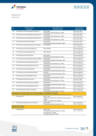 PT Pertamina Hulu Energi 361 2022AppendixLampiranNo Anak PerusahaanSubsidiaryKepemilikan SahamShare OwnershipStatus OperasiOperating Status48 PT Pertamina Hulu Energi Metan Tanjung IV PHE: 99,00%PT Pertamina Hulu Energi Arun: 1,00%Status: Non AktifStatus: Non Active49 PT Pertamina Hulu Energi Metana Kalimantan A PHE: 99,00%PT Pertamina Hulu Energi Arun: 1,00%Status: Non AktifStatus: Non Active50 PT Pertamina Hulu Energi Metana Kalimantan B PHE: 99,00%PT Pertamina Hulu Energi Arun: 1,00%Status: Non AktifStatus: Non Active51 PT Pertamina Hulu Energi Tengah K PHE: 99,00%PT Pertamina Geothermal Energy: 1,00%Status: Non AktifStatus: Non Active52 PT Pertamina Hulu Energi Nunukan Company PHE: 100,00% Status: BeroperasiStatus: In Operation 53 PT Pertamina Hulu Energi Ambalat Ltd PHE: 100,00% Status: BeroperasiStatus: In Operation 54 PT Pertamina Hulu Energi Bukat Ltd PHE: 100,00% Status: BeroperasiStatus: In Operation 55 PT Pertamina Hulu Energi Tuban PHE: 99,99%PT Pertamina Hulu Energi Arun: 0,01%Status: BeroperasiStatus: In Operation 56 PT Pertamina Hulu Energi West Madura Offshore PHE: 99,00%PT Pertamina Geothermal Energy: 1,00%Status: BeroperasiStatus: In Operation 57 PT Pertamina Hulu Energi Randugunting PHE: 99,00%PT Pertamina Hulu Energi Arun: 1,00%Status: BeroperasiStatus: In Operation 58 PT Pertamina Hulu Energi Tuban East Java PHE: 99,00%PT Pertamina Geothermal Energy: 1,00%Status: BeroperasiStatus: In Operation 59 PT Pertamina Hulu Energi Salawati PHE: 99,00%PT Pertamina Geothermal Energy: 1,00%Status: BeroperasiStatus: In Operation 60 PT Pertamina Hulu Energi Salawati Basin PHE: 99%PT Pertamina Geothermal Energy: 1,00%Status: BeroperasiStatus: In Operation 61 PT Pertamina Hulu Energi Babar Selaru PHE: 99,50%PT Pertamina Hulu Energi Arun: 0,50%Status: BeroperasiStatus: In Operation 62 PT Pertamina Hulu Energi Semai II PHE: 99,00%PT Pertamina Hulu Energi Arun: 1,00%Status: Non AktifStatus: Non Active63 PT Pertamina Hulu Energi Tomori Sulawesi PHE: 99,00%PT Pertamina Geothermal Energy: 1,00%Status: BeroperasiStatus: In Operation 64 PT Pertamina Hulu Energi Makassar Strait PHE: 99,00%PT Pertamina Geothermal Energy: 1,00%Status: BeroperasiStatus: In Operation 65 PT Pertamina Hulu Energi Sumbangut PHE: 99,50%PT Pertamina Hulu Energi Arun: 0,50%Status: BeroperasiStatus: In Operation Bidang Usaha: Jasa Hulu Migas, Jasa Penunjang Migas, Jasa Distribusi & LogistikLine of Business: Upstream Oil and Gas Services, Oil and Gas Support Services, Distribution & Logistics Services 1 PT Elnusa Tbk PHE: 41,10%Dana Pensiun Pertamina | Pertamina Pension Fund: 14,90%Publik <5% | Public <5%: 44,00%Status: BeroperasiStatus: In Operation 2 PT Pertamina Drilling Services Indonesia PHE: 99,89%PT Pertamina Pedeve Indonesia: 0,11%Status: BeroperasiStatus: In Operation Bidang Usaha: EnergiBusiness Field: Energy 1 PT Badak NGL PHE: 55,00%PT Pertamina Pedeve Indonesia: 15,00%Vico Indonesia: 20,00%Total E&P Indonesia: 10,00%Status: BeroperasiStatus: In Operation