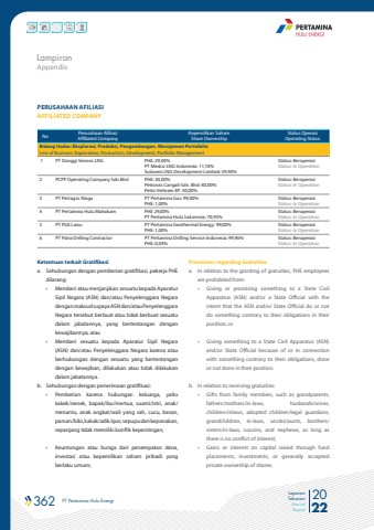 362 PT Pertamina Hulu Energi 2022Laporan TahunanAnnual ReportPERUSAHAAN AFILIASIAFFILIATED COMPANYNo Perusahaan Afiliasi Affiliated CompanyKepemilikan SahamShare OwnershipStatus OperasiOperating StatusBidang Usaha: Eksplorasi, Produksi, Pengembangan, Manajemen PortofolioLine of Business: Exploration, Production, Development, Portfolio Management 1 PT Donggi Senoro LNG PHE: 29,00%PT Medco LNG Indonesia: 11,10%Sulawesi LNG Development Limited: 59,90%Status: BeroperasiStatus: In Operation 2 PCPP Operating Company Sdn.Bhd PHE: 30,00%Petronas Carigali Sdn. Bhd: 40,00%Petro Vietnam EP: 30,00%Status: BeroperasiStatus: In Operation 3 PT Pertagas Niaga PT Pertamina Gas: 99,00%PHE: 1,00%Status: BeroperasiStatus: In Operation 4 PT Pertamina Hulu Mahakam PHE 29,00%PT Pertamina Hulu Indonesia: 70,93%Status: BeroperasiStatus: In Operation 5 PT PGE Lawu PT Pertamina Geothermal Energy: 99,00%PHE: 1,00%Status: BeroperasiStatus: In Operation 6 PT Patra Drilling Contractor PT Pertamina Drilling Service Indonesia: 99,96%PHE: 0,04%Status: BeroperasiStatus: In Operation Ketentuan terkait Gratifikasia. Sehubungan dengan pemberian gratifikasi, pekerja PHE dilarang:%u2022 Memberi atau menjanjikan sesuatu kepada Aparatur Sipil Negara (ASN) dan/atau Penyelenggara Negara dengan maksud supaya ASN dan/atau Penyelenggara Negara tersebut berbuat atau tidak berbuat sesuatu dalam jabatannya, yang bertentangan dengan kewajibannya; atau%u2022 Memberi sesuatu kepada Aparatur Sipil Negara (ASN) dan/atau Penyelenggara Negara karena atau berhubungan dengan sesuatu yang bertentangan dengan kewajiban, dilakukan atau tidak dilakukan dalam jabatannya.b. Sehubungan dengan penerimaan gratifikasi:%u2022 Pemberian karena hubungan keluarga, yaitu kakek/nenek, bapak/ibu/mertua, suami/istri, anak/menantu, anak angkat/wali yang sah, cucu, besan, paman/bibi, kakak/adik/ipar, sepupu dan keponakan, sepanjang tidak memiliki konflik kepentingan;%u2022 Keuntungan atau bunga dari penempatan dana, investasi atau kepemilikan saham pribadi yang berlaku umum;AppendixLampiranProvisions regarding Gratuitiesa. In relation to the granting of gratuities, PHE employees are prohibited from:%u2022 Giving or promising something to a State Civil Apparatus (ASN) and/or a State Official with the intent that the ASN and/or State Official do or not do something contrary to their obligations in their position; or%u2022 Giving something to a State Civil Apparatus (ASN) and/or State Official because of or in connection with something contrary to their obligations, done or not done in their position.b. In relation to receiving gratuities:%u2022 Gifts from family members, such as grandparents, fathers/mothers/in-laws, husbands/wives, children/inlaws, adopted children/legal guardians, grandchildren, in-laws, uncles/aunts, brothers/sisters/in-laws, cousins, and nephews, as long as there is no conflict of interest;%u2022 Gains or interest on capital raised through fund placements, investments, or generally accepted private ownership of shares;