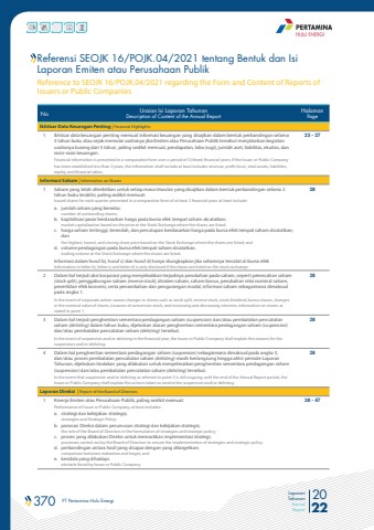 370 PT Pertamina Hulu Energi 2022Laporan TahunanAnnual ReportReferensi SEOJK 16/POJK.04/2021 tentang Bentuk dan Isi Laporan Emiten atau Perusahaan PublikReference to SEOJK 16/POJK.04/2021 regarding the Form and Content of Reports of Issuers or Public CompaniesNo Uraian Isi Laporan TahunanDescription of Content of the Annual ReportHalamanPageIkhtisar Data Keuangan Penting | Financial Highlights1 Ikhtisar data keuangan penting memuat informasi keuangan yang disajikan dalam bentuk perbandingan selama 3 tahun buku atau sejak memulai usahanya jika Emiten atau Perusahaan Publik tersebut menjalankan kegiatan usahanya kurang dari 3 tahun, paling sedikit memuat, pendapatan, laba (rugi), jumlah aset, liabilitas, ekuitas, dan rasio-rasio keuangan.Financial information is presented in a comparative form over a period of 3 (three) financial years; if the Issuer or Public Company has been established less than 3 years, the information shall include at least includes revenue, profit (loss), total assets, liabilities; equity, and financial ratios.23 - 27Informasi Saham | Information on Shares1 Saham yang telah diterbitkan untuk setiap masa triwulan yang disajikan dalam bentuk perbandingan selama 2 tahun buku terakhir, paling sedikit memuat:Issued shares for each quarter presented in a comparative form of at least 2 financial years at least include:a. jumlah saham yang beredar;number of outstanding shares;b. kapitalisasi pasar berdasarkan harga pada bursa efek tempat saham dicatatkan;market capitalization based on the price at the Stock Exchange where the shares are listed;c. harga saham tertinggi, terendah, dan penutupan berdasarkan harga pada bursa efek tempat saham dicatatkan; danthe highest, lowest, and closing share price based on the Stock Exchange where the shares are listed; andd. volume perdagangan pada bursa efek tempat saham dicatatkan.trading volume at the Stock Exchange where the shares are listed.Informasi dalam huruf b), huruf c) dan huruf d) hanya diungkapkan jika sahamnya tercatat di bursa efekInformation in letter b), letter c) and letter d) is only disclosed if the shares are listed on the stock exchange.282 Dalam hal terjadi aksi korporasi yang menyebabkan terjadinya perubahan pada saham, seperti pemecahan saham (stock split), penggabungan saham (reverse stock), dividen saham, saham bonus, perubahan nilai nominal saham, penerbitan efek konversi, serta penambahan dan pengurangan modal, informasi saham sebagaimana dimaksud pada angka 1. In the event of corporate action causes changes in shares such as stock split, reverse stock, stock dividend, bonus shares, changes in the nominal value of shares, issuance of conversion stock, and increasing and decreasing interests; information on shares as stated in point 1.283 Dalam hal terjadi penghentian sementara perdagangan saham (suspension) dan/atau pembatalan pencatatan saham (delisting) dalam tahun buku, dijelaskan alasan penghentian sementara perdagangan saham (suspension) dan/atau pembatalan pencatatan saham (delisting) tersebut.In the event of suspension and/or delisting in the financial year, the Issuer or Public Company shall explain the reasons for the suspension and/or delisting.284 Dalam hal penghentian sementara perdagangan saham (suspension) sebagaimana dimaksud pada angka 3, dan/atau proses pembatalan pencatatan saham (delisting) masih berlangsung hingga akhir periode Laporan Tahunan, dijelaskan tindakan yang dilakukan untuk menyelesaikan penghentian sementara perdagangan saham (suspension) dan/atau pembatalan pencatatan saham (delisting) tersebut.In the event that suspension and/or delisting as referred to point 3 is still ongoing until the end of the Annual Report period, the Issuer or Public Company shall explain the actions taken to resolve the suspension and/or delisting.28Laporan Direksi | Report of the Board of Directors1 Kinerja Emiten atau Perusahaan Publik, paling sedikit memuatPerformance of Issuer or Public Company, at least includes:a. strategi dan kebijakan strategis;strategies and Strategic Policy:b. peranan Direksi dalam perumusan strategi dan kebijakan strategis;the role of the Board of Directors in the formulation of strategies and strategic policy;c. proses yang dilakukan Direksi untuk memastikan implementasi strategi;processes carried out by the Board of Directors to ensure the implementation of strategies and strategic policy;d. perbandingan antara hasil yang dicapai dengan yang ditargetkan;comparison between realization and target; ande. kendala yang dihadapi.obstacle faced by Issuer or Public Company.38 - 47